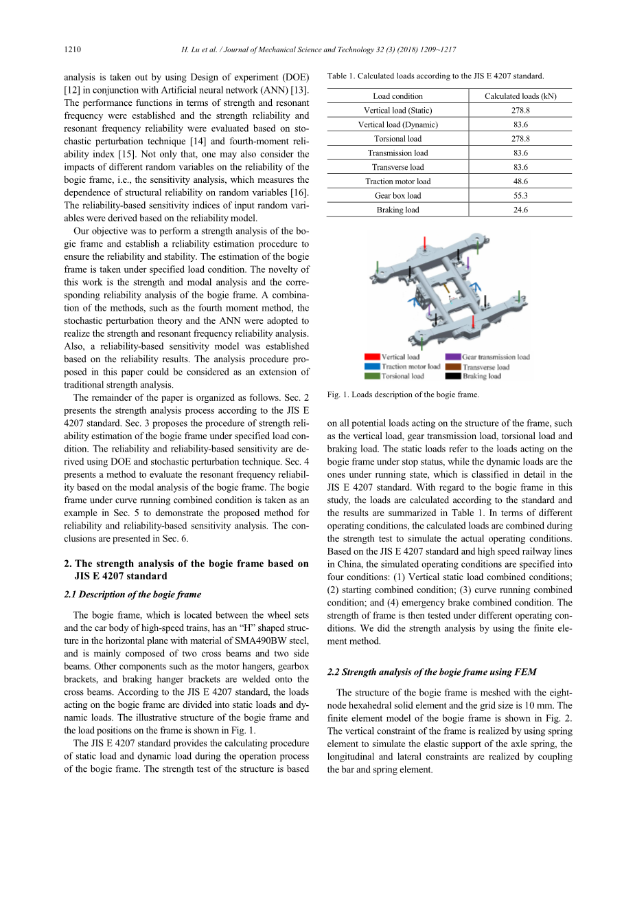 本文的其余部分内容如下。第2节根据JIS e4207标准给出了强度分析过程。第3节提出了转向架构架在规定载荷条件下的强度可靠性估算方法。利用DOE和随机摄动技术,推导了基于可靠性和可靠性的灵敏度。第4节提出了一种基于转向架构架模态分析的谐振频率可靠性评估方法。第5节以曲线运行组合工况下的转向架构架为例,说明了基于可靠性和可靠性的灵敏度分析方法。结论见第6节。