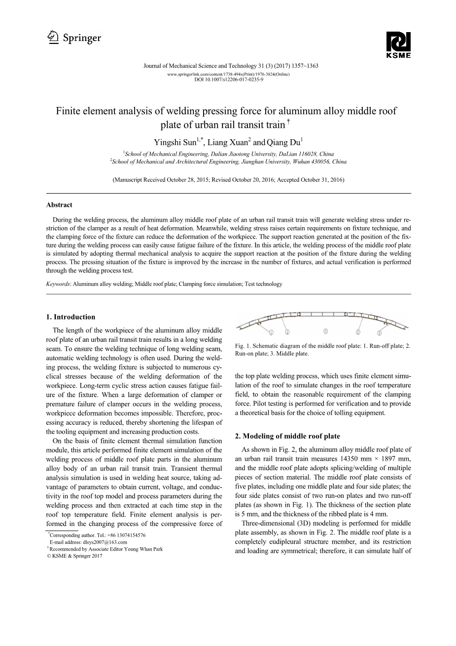 城市轨道交通列车铝合金中顶板焊接压力有限元分析外文翻译资料 2021-11-05 21:44:10 英语原文共 7 页 英语原文共 10 页 原文和译文剩余内容已隐藏,您需要先支付 30元 才能查看原文和译文全部内容!立即支付 发小红书推广免费获取该资料资格。点击链接进入获取推广文案即可: Ai一键组稿 | 降AI率 | 降重复率 | 论文一键排版 PREVIOUS NEXT 您可能感兴趣的文章 流化床包衣造粒过程的监测与控制研究外文翻译资料 一种新颖的旋转流化床包衣细颗粒涂层的方法外文翻译资料 中国城市垃圾的处理和管理外文翻译资料 滤袋、气旋、和湿式除尘方法在真空吸尘器中的比较外文翻译资料 一个灵活的模型辗环机设计外文翻译资料 带有柔性转子的主动电磁轴承系统的识别外文翻译资料 柔性阻尼支承下转子振动特性实验外文翻译资料 MapReduce:超大集群上的数据简化处理外文翻译资料 垂直循环式立体车库的停车与乘车调度优化外文翻译资料 高灵敏度、高稳定性的自温度补偿电涡流位移传感器外文翻译资料