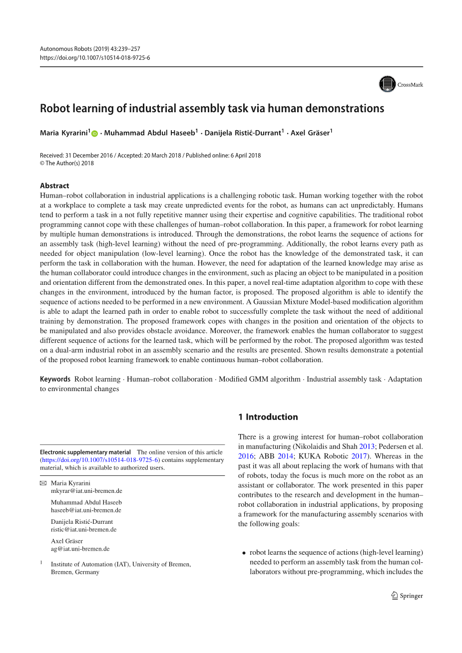人与机器人在制造业中的合作越来越受到关注(Nikolaidis and Shah 2013; Pedersen et al. 2016; ABB 2014; KUKA Robotic 2017)。虽然过去研究的重点都是用机器人替换人类的工作,但今天的重点更多地放在让机器人作为助手或合作者。本文介绍的方法是通过提出制造装配方案的框架,有助于研究和开发工业应用中的人机协作,研究的目标有:机器人学习在无需预编程的前提下与人类合作者执行装配任务所需的动作序列(高级学习),其中包括对象移动和抓取/释放动作(轨迹的低级学习),在没有额外的训练的情况下机器人适应学习由人类合作者引入的环境变化的路径,以及机器人在人类合作者的建议之后以不同的发生顺序执行学习的动作序列。如果人类协作者对新的动作序列感到满意,则机器人会学习它。