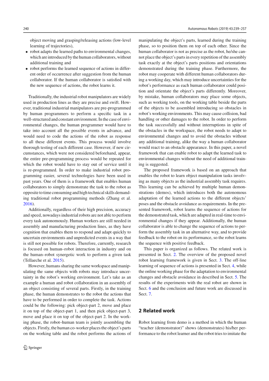 传统上,工业机器人操纵器因其精确和迅速的特点而广泛用于生产线。然而,传统的工业操纵器由人类程序员预先编程,在结构良好且恒定的环境中执行特定任务。在环境变化的情况下,人类程序员必须事先考虑所有可能的事件,并且需要将机器人的动作编码对所有这些不同事件而分别设置。这个过程将涉及对每个不同案例的彻底测试。然而,如果出现了未事先考虑的新情况,则将重新进行整个预编程过程,机器人将不得不停止工作直到重新获得新的程序。为了使工业机器人编程更容易,几种技术在过去几年已经得到了使用。其中之一是设定一个框架,使人类合作者能够简单地向机器人演示任务,这种方法不需要传统机器人编程方法的高耗时和高技术技能(Zhang et al.2016)。此外,无论其精度,准确性和速度如何,现在的工业机器人都无法自主执行每项任务。在装配和制造生产线中仍然需要人工,因为人工方法具有机器人仍然无法实现的快速响应和方式适应不确定环境和不可预测事件的认知能力。因此,目前研究的重点是工业中的人机交互以及执行特定任务的人机协同工作(Tellaeche et al. 2015)。