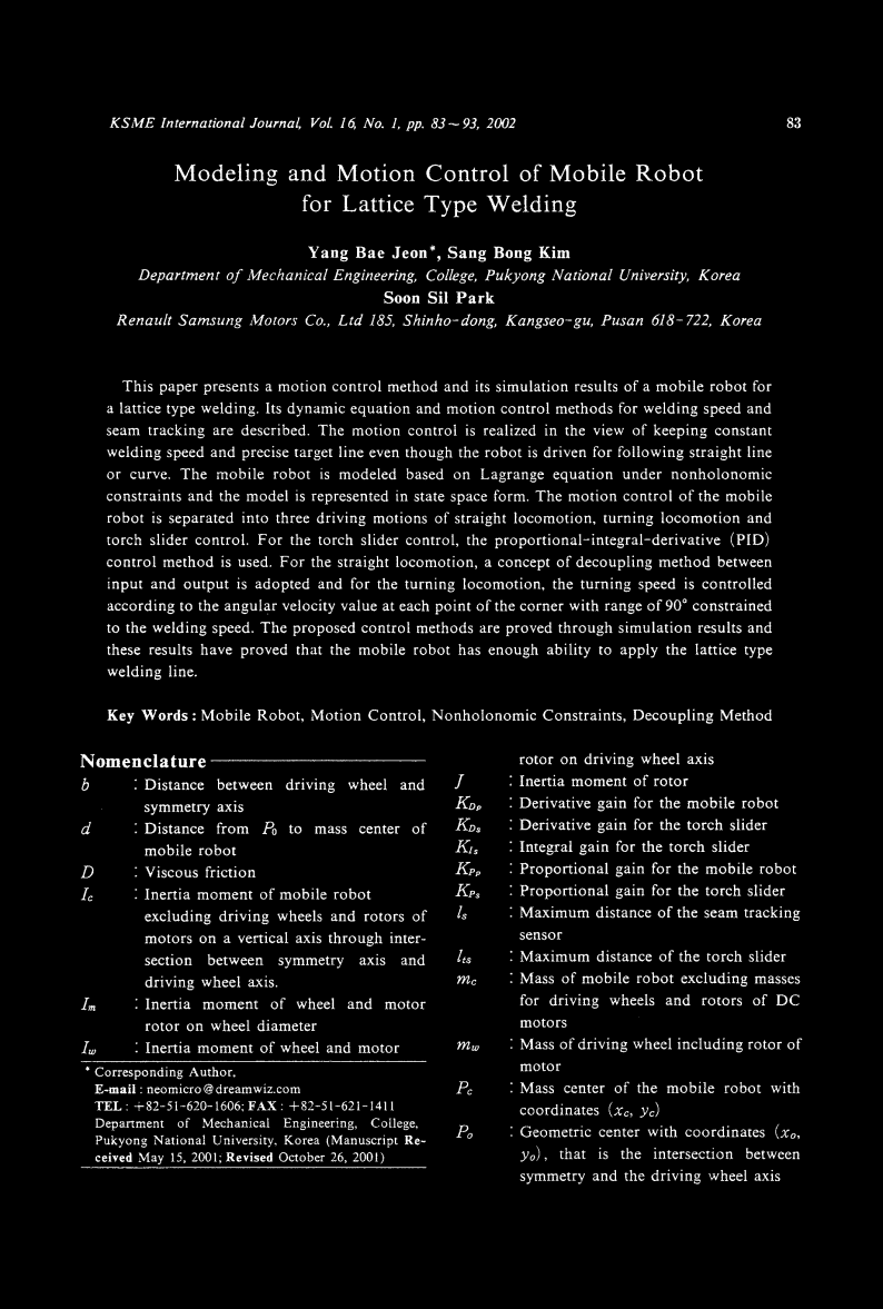 本文中,基于非完整约束下的拉格朗日方程对移动机器人进行建模,并以状态空间形式表示模型。针对上述问题,提出了三种焊接移动机器人的控制算法:直线运动、焊缝跟踪和转向运动控制。直线运动采用输入输出解耦的方法。采用 PID 控制方法对焊枪滑块进行焊缝跟踪控制和车削运动控制。转弯速度由拐角的每个点处的角速度值控制,其范围为约90°的焊接速度。仿真结果验证了所提出的控制系统的有效性。
