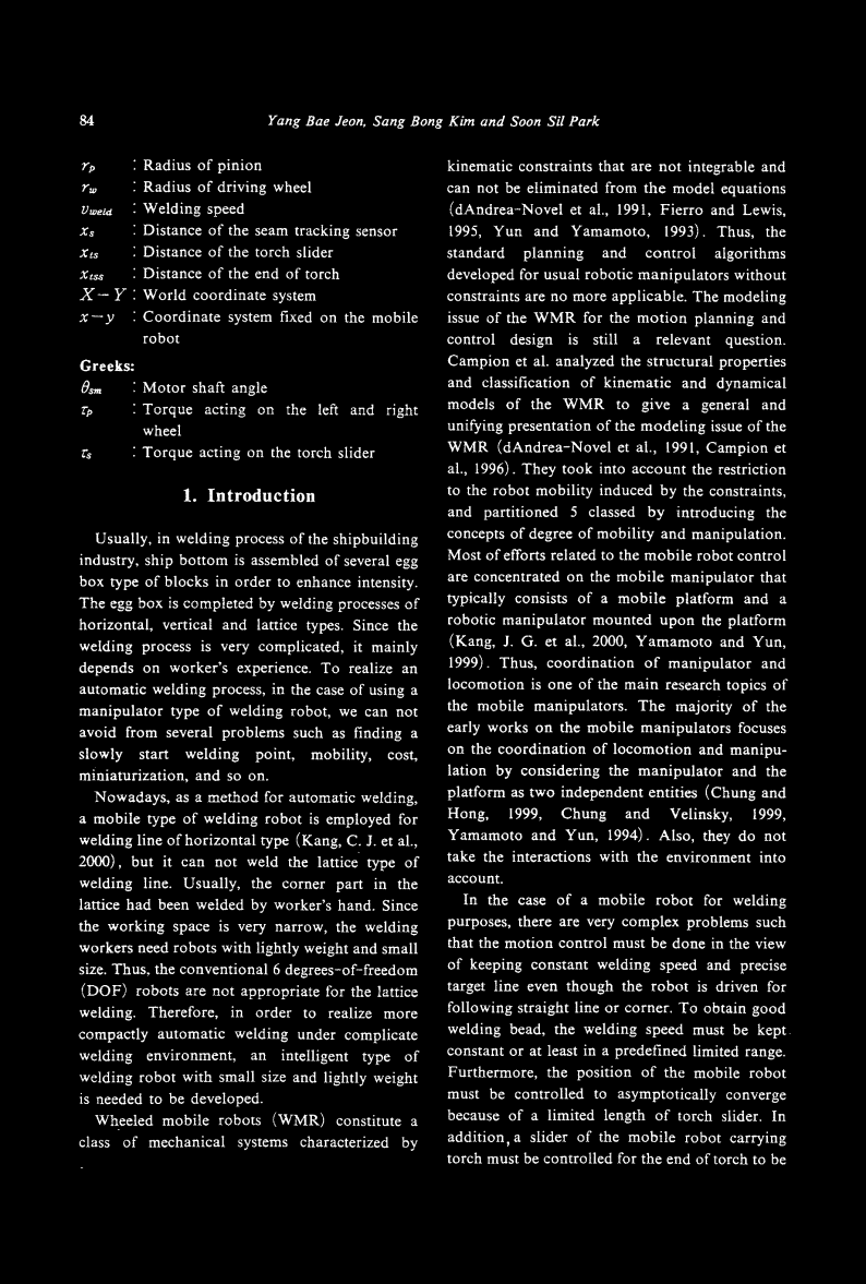 在焊接移动机器人中,存在着复杂的运动控制问题,即使驱动机器人沿直线或拐角运动,也必须在保持焊接速度恒定的情况下进行运动控制。为了获得良好的焊缝,焊接速度必须保持恒定或至少在预定的范围内。此外,由于火把滑块的长度有限,必须对移动机器人的位置进行控制,使其渐近收敛。此外,必须控制携带火炬的移动机器人的滑块,才能使火炬末端保持在焊接目标线上。