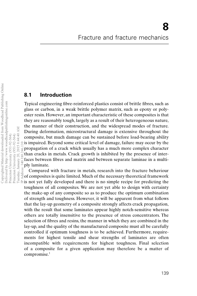 在复合材料中, 纤维会干扰裂纹的生长, 但其作用取决于它们与基体 (树脂) 的结合强度。例如, 如果纤维-基体键是强的, 裂纹可以通过纤维和基体没有偏差, 在这种情况下, 复合韧性将很低, 大约等于单独成分的总和 toughness:[8.5] 其中 (gF) f 和 (gF) m 分别是断裂的纤维和基质工作。纤维体积分数为 vf。另一方面, 如果纤维-基体粘结较弱, 裂纹路径变得非常复杂, 许多单独的损伤机制可能会对复合材料的整体断裂工作产生影响。这些断裂过程由复合材料的组成材料及其组合方式控制。例如, 一个脆性聚合物或环氧树脂与 GIc @ 0.1 kjmm2 和脆性玻璃纤维与 GIc @ 0.01 kjmm2 可以结合在一起的复合材料, 其中一些具有能量。