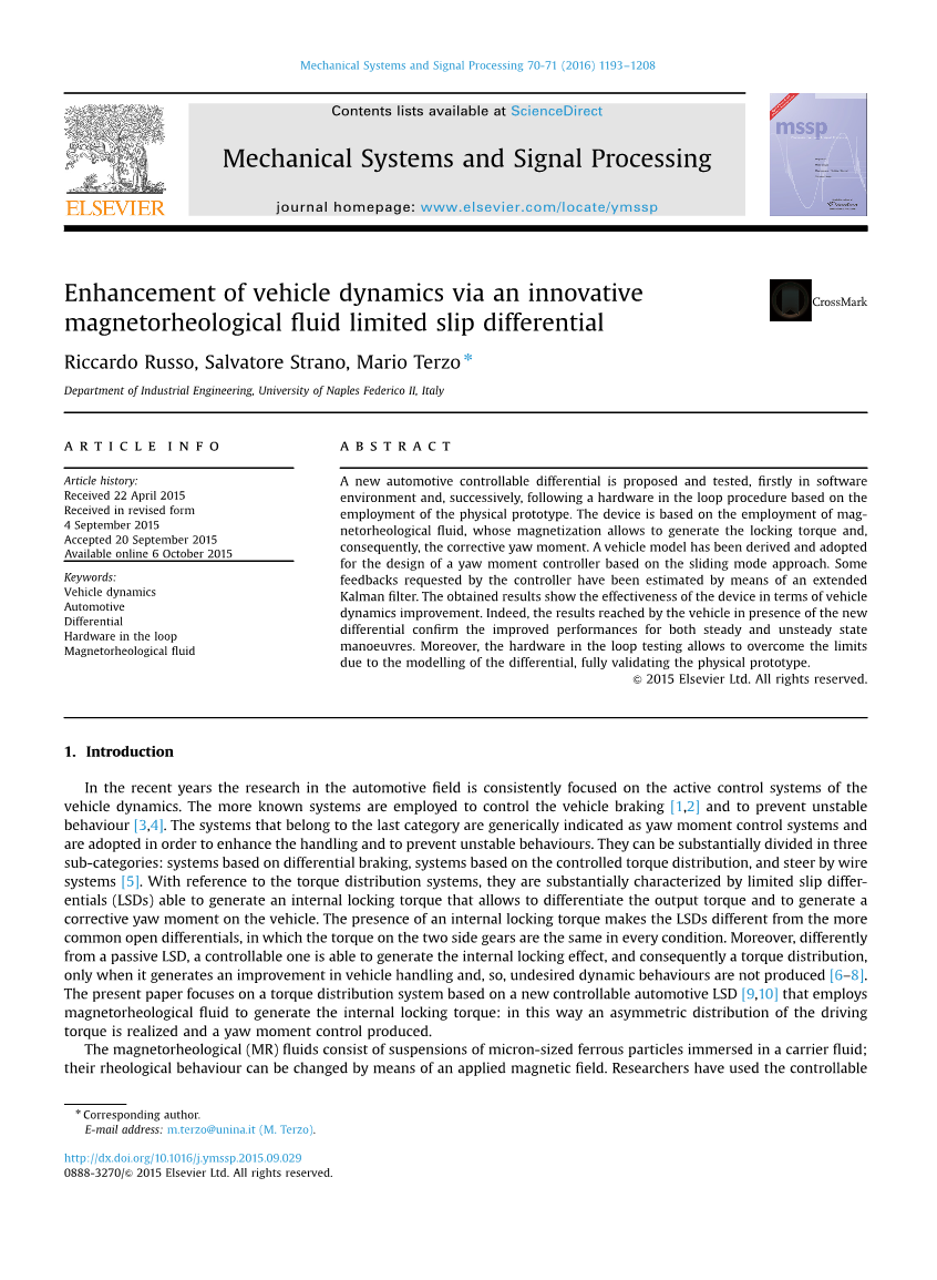 磁流变(MR)流体由微米大小的铁粒子悬浮在载体流体中组成;它们的流变行为可以通过外加磁场来改变。研究人员利用屈服应力的控制变量来开发各种智能设备,如减振器、变速器离合器和制动器[11-17],但科学文献中没有关于基于MR流体的汽车差速器设计和开发的例子。因为它会更详细的文本中,新的磁流变液限滑差速器LSD (MRF)可分为半有源设备,在这个类别,它的特点是不需要侵入性的根本优势附加驱动系统(如液压回路)进行内部部分锁紧扭矩的生成。此外,无滑动部件接触,这是典型的半主动多盘离合器的有限滑差[18],减少粘滑和磨损现象。从动态性能上看,磁流变液的瞬态特性使该装置成为偏航力矩控制[10]的功能系统。