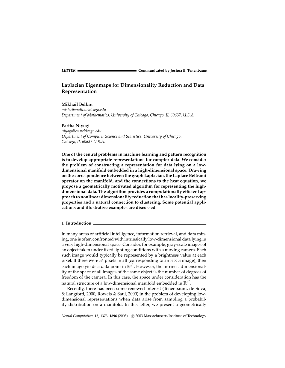 最近,随着来自于流形的概率分布采样的数据增多,对于开发低维表示的问题,已经有了一些新的兴趣(Tenenbaum,de Silva,&Langford,2000; Roweis&Saul,2000)。本文中,我们提出了几何驱动算法和一个伴随问题的分析框架。
