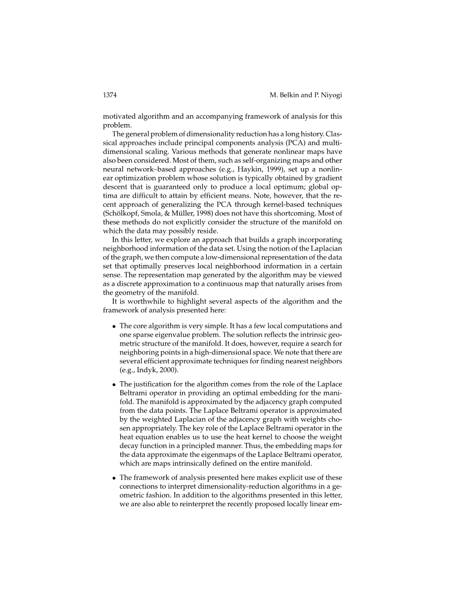 核心算法非常简单。它有一些局部计算和一个稀疏特征值问题。该解决方案反映了流形的内在几何结构。但是,它确实需要搜索高维空间中的相邻点。我们注意到有几种高效的近似技术可用于寻找最近邻居(如Indyk,2000)。
