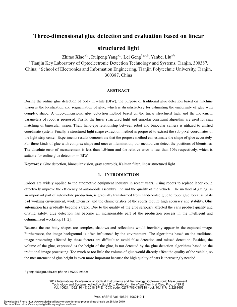 关键词:涂胶检测;双目视觉;灰度质心;卡尔曼滤波;线性结构光