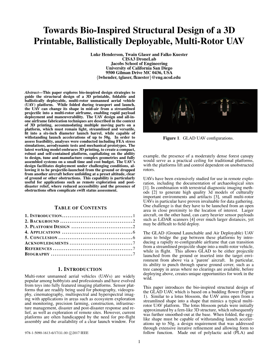 摘要—本文探讨了用仿生设计策略来指导一个3D打印的结构设计,可折叠和弹道部署,多旋翼无人飞行器(UAV)平台。在运输和发射过程中折叠无人机可以在空中改变其形状从流线型弹丸到多旋翼机身,使快速有效载荷部署和机动性。无人机设计的整体机身的制造技术是3D打印技术的背景下,多个运动部件容纳在一个平台上,它必须保持精简和灵活,适合六英寸直径的发射筒,能承受发射加速度可达50g。为了评估可行性进行了分析,包括应力有限元模拟空气动力试验及力学模型。最新的工作模式包括3D打印,创造一个紧凑,强大和独立的平台,利用它的能力设计调整和制造复杂的几何形状和完全组装的系统在一个小的时间和成本预算。无人机的设计有利于在有挑战性的条件下进行部署,允许它从地面发射或从另一架飞机发射升空,然后在预先设定的高度展开,地面或其他障碍物除外。这种能力的应用如远程探测和灾后救援是非常有用的。