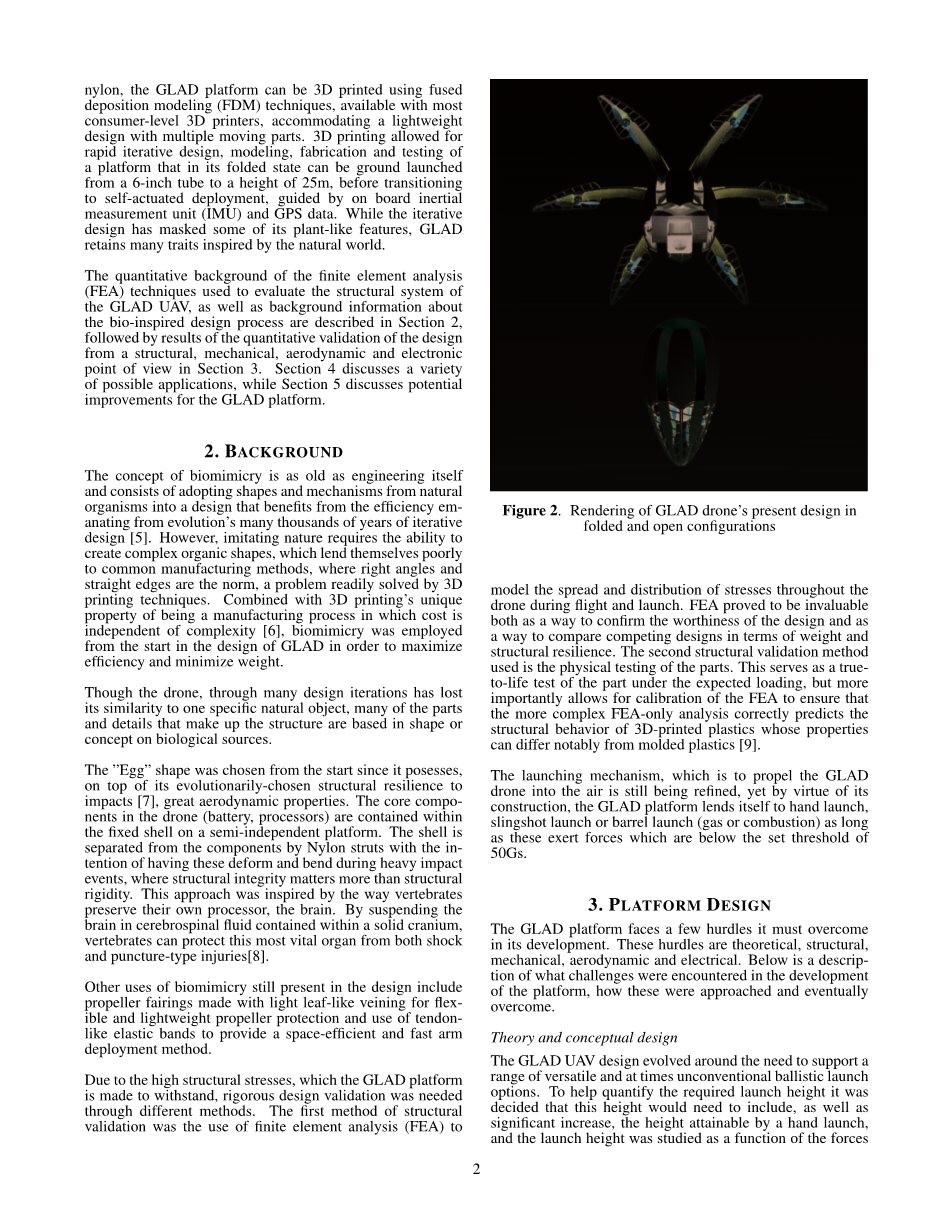 例如,一个适度密集的森林冠层将作为一个实用的传统平台的天花板,平台升降机和控制依赖于通畅的转子。 无人机已被广泛研究用于远程勘探,包括考古遗址的文献[ 1 ]。结合地面诊断成像方法[ 2 ],以产生高质量三维模型的文化重要的环境和工件[ 3 ],小型多旋翼无人机,尤其是证明了数据收集的宝贵。一个挑战是,它们必须从靠近感兴趣地点的开阔区域发射。另一方面,较大的飞机,可以携带更大的传感器有效载荷,如激光雷达扫描仪[ 4 ]在更大的距离,但可能难以现场部署。The GLAD(地面发射和空中部署无人机目标)之间的桥梁,这些平台的差距通过引入一个能从流线型弹体形状为多旋翼飞行器过渡迅速重新配置的飞机,在飞行中,这可以让The GLAD从地面发射,或者通过“母飞机”从上面插入目标环境。特别是,它的穿透稀疏的地面覆盖能力,如在没有空地可用区域的树冠,在野外工作,在部署之前,创造了独特的机会。本文介绍了一种基于芽接花的无人机的仿生结构设计(图1)。类似于莲花,无人机的双臂从流线型的外形塑造成了一个典型的无人机平台multirotor模仿。莲花花瓣最初近似于蕨类状的三维结构,随后在底部进一步平滑。折叠后egglike形状必须能够承受发射加速度达50g,一个设计要求,通过迭代求精,让形式追随功能解决。由聚乳酸(PLA)和尼龙制成,GLAD平台可以用熔融沉积建模(FDM)技术,与大多数消费水平的3D打印机相同,可容纳多个运动部件轻量化设计三维打印。3D打印技术允许快速迭代设计、建模、和测试平台,在折叠的状态下可从地面6英寸管高度25m推出制造,然后过渡到自行部署,船上的惯性测量单元(IMU)和GPS数据。虽然迭代设计掩盖了它的某些植物特征,但它仍然保留了自然界所激发的许多特性。有限元分析的定量背景(FEA)用于评估的 GLAD无人机结构系统技术,以及关于仿生设计过程的背景信息是在2节中描述的,其次设计的气动和电子点定量验证结果从结构、机械来看。第4节讨论了各种可能的应用程序,而第5节讨论了 GLAD平台的潜在改进。