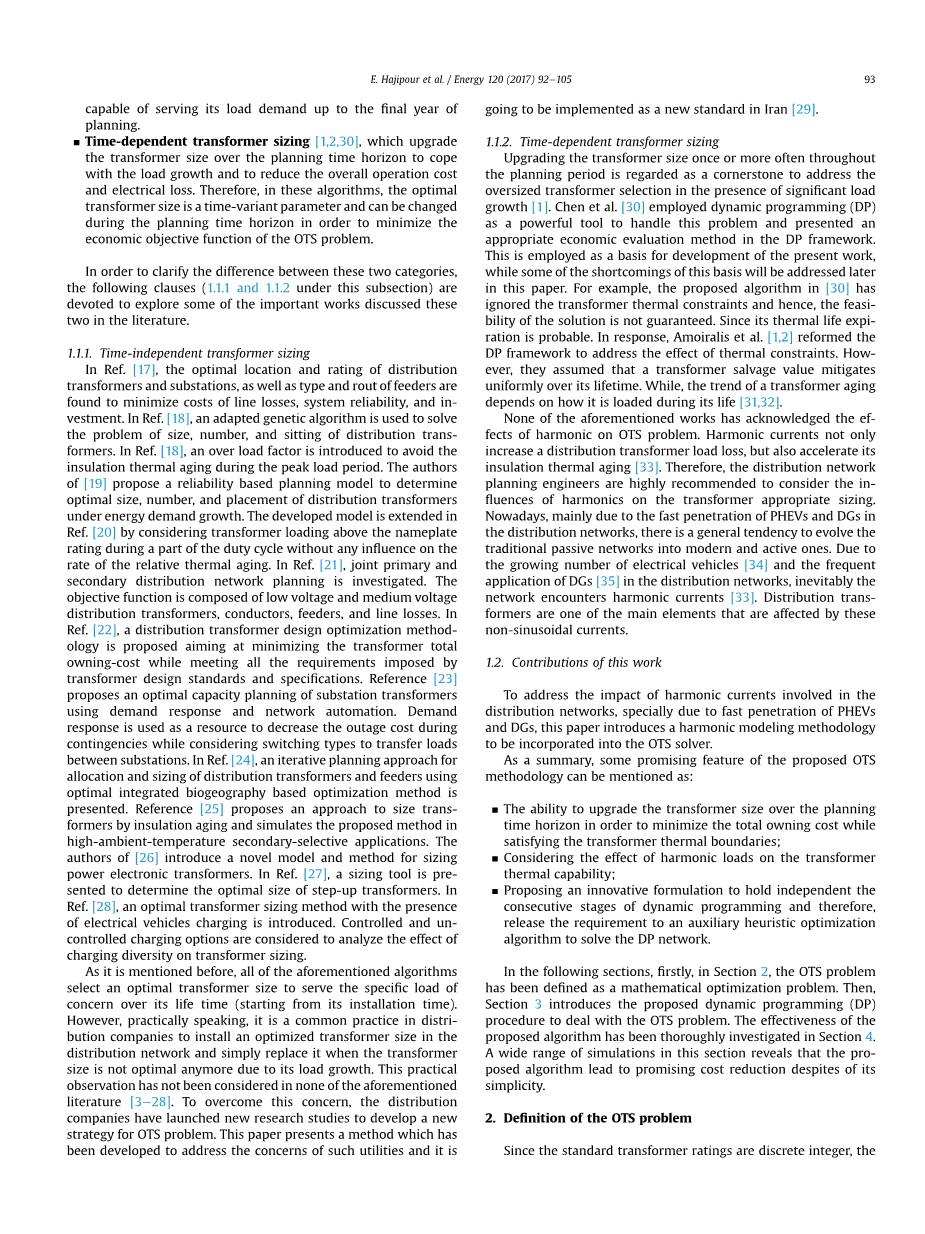 在整个计划期间,一次或多次更新变压器的大小被认为是解决在有显著负荷增长的情况下超大变压器选择的基石[ 1 ]。陈等人[ 30 ]利用动态规划(DP)作为一个强有力的工具来处理这个问题,并在DP框架中提出了一种适当的经济评价方法。这是作为本工作发展的基础,而在此基础上的一些缺点将在本文后面加以讨论。例如,在[ 30 ]中所提出的算法忽略了变压器热约束,因此,该解决方案的可行性不能得到保证。因为它的热寿命失效是可能的。对此,Amoiralis等人。[1,2]对动态规划框架进行了改进,以解决热约束的影响。然而,他们假设变压器打捞值在其寿命期间均匀地减轻。同时,变压器的老化趋势取决于它在寿命期中 [31,32]如何负载。