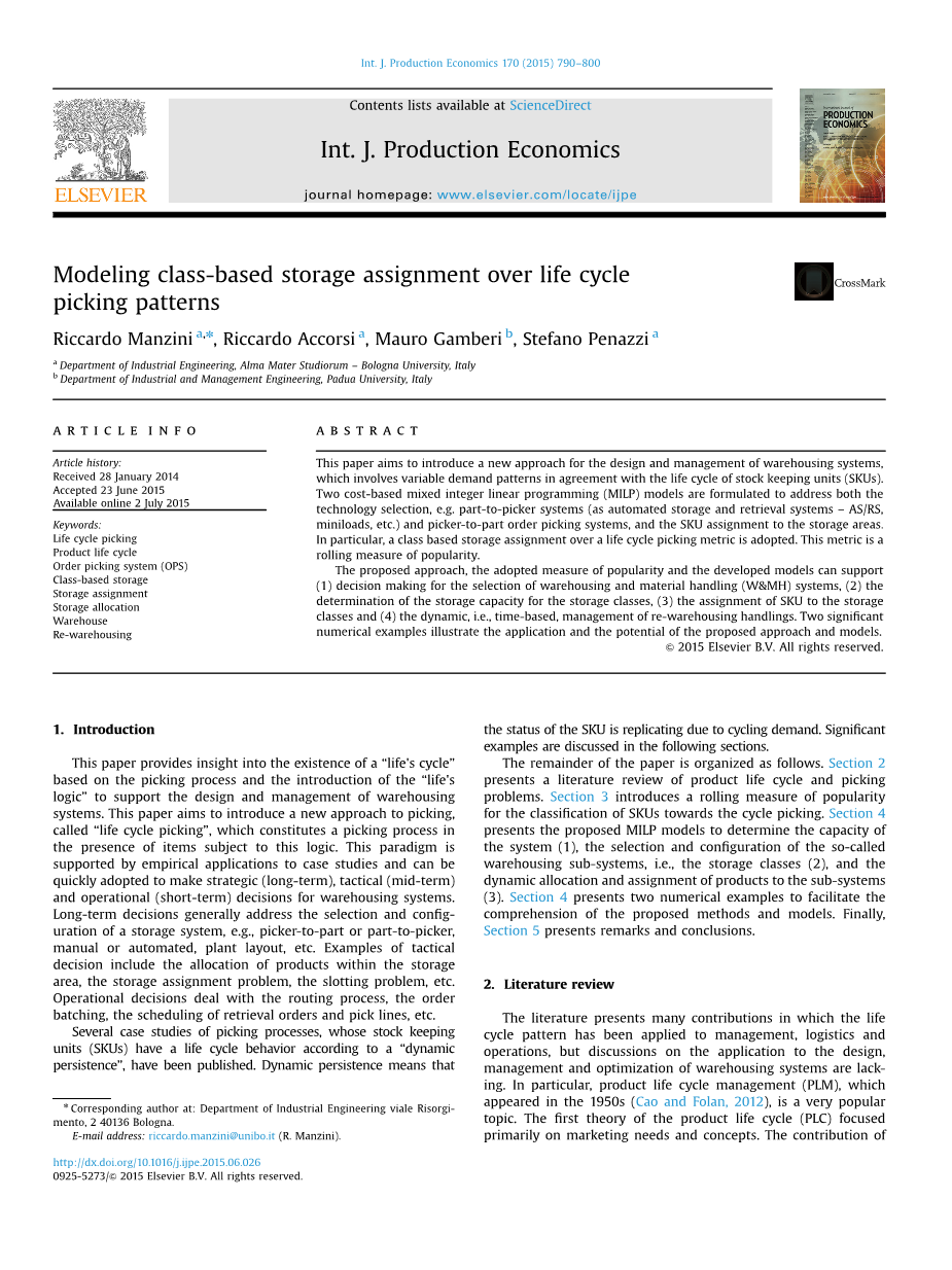 关键词:周期采摘,产品生命周期,订单拣选系统(OPS),基于类的存储,存储分配,仓库