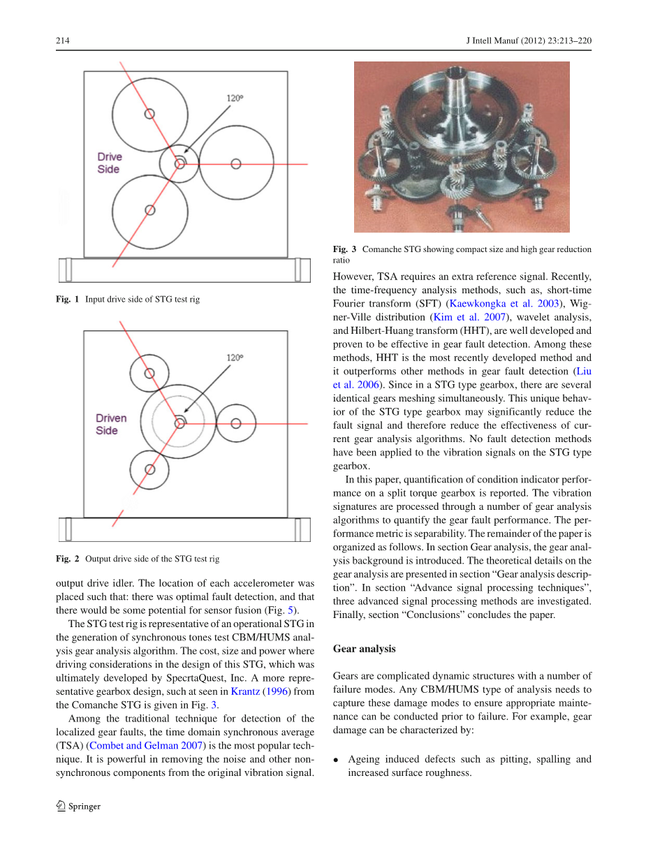 在传统的定位齿轮故障检测技术中, 时域同步平均 (TSA) (Combet 和 Gelman 2007) 是最常用的技术。它是强大的消除噪音和其他不同步组件的原始振动信号。但是, TSA 需要额外的参考信号。近年来, 短时傅立叶变换 (SFT) (Kaewkongka 等 2003)、维格纳分布 (Kim et 等 2007)、小波分析和希尔伯特-黄变换 (HHT) 等时频分析方法得到了很好的发展, 并被证明是有效的齿轮故障检测。在这些方法中, HHT 是最近开发的一种方法, 它优于其它齿轮故障检测方法 (2006)。由于在 STG 型变速箱中, 有几个相同的齿轮同时啮合。STG 型变速箱的这种独特行为可以显著减少故障信号, 从而降低电流齿轮分析算法的有效性。STG 型变速箱的振动信号没有采用故障检测方法。