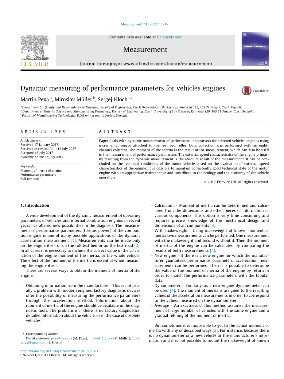 许多作者的研究描述了内燃机性能参数的动态测量[6–10]具有确定转动惯量的可能性的道路车辆。结果表明,该动态测量方法具有足够的准确性,尤其适用于服务测量。性能参数的动态测量方法并不是为了用测功机来代替现有的测量方法[11–15],它在指令(CSN ISO 9249、CSN ISO 789-1、CSN ISO 789-5、CS ISO 789-9)中作了规定,但它为这些同族测量提供了一种服务选择[16,17]。