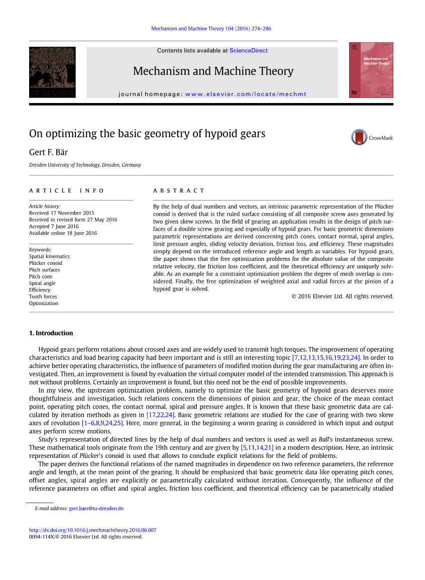 本文根据两个参考参数角度和长度,在传动装置的中点推导出命名量的函数关系。应该强调的是,基本的几何数据,如操作锥形锥,偏移角度,螺旋角度明确或参数计算而无需迭代。 因此,这种影响可以参数化研究和优化偏移量和螺旋角参考参数,摩擦损失系数和理论效率。 此外,对加权轴向和径向力的目标函数进行了描述和举例评估,并对约束进行了探讨。