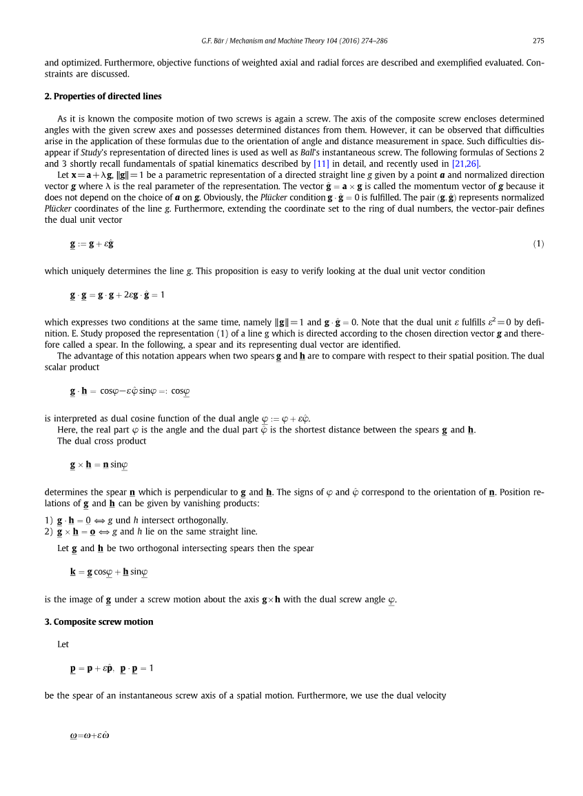 我们可以知道两个螺旋运动的复合运动又是一个螺旋运动。复合螺旋运动的轴线与给定的螺旋轴线围成确定的角度,并具有确定的距离。然而,可以看出,由于空间角度和距离测量的方向,这些公式的应用出现了困难。如果研究有向线的表示,以及Ball瞬时螺旋运动,这样的困难就消失了。下面的第2节和第3节的公式简要回顾了[11]详细描述的空间运动学基础,并在[21,26]中使用。