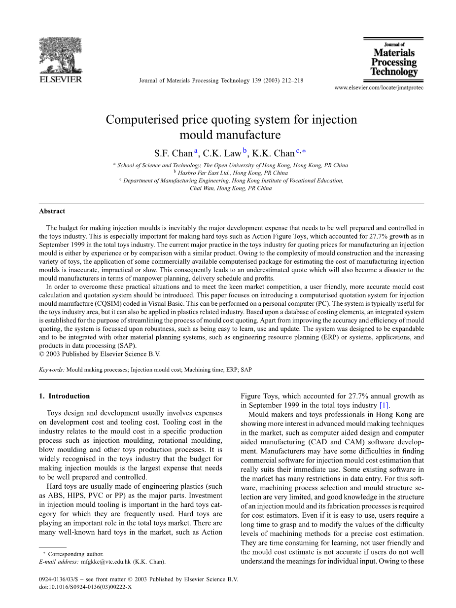 为了克服这些实际情况并应对激烈的市场竞争,应引入用户友好,更准确的模具成本计算和报价系统。 本文着重介绍在Visual Basic中编写的注塑模具制造计算机报价系统(CQSIM)。 这可以在个人计算机(PC)上执行。 该系统通常用于玩具行业,但也可用于塑料相关行业。 基于成本要素数据库,建立了一个综合系统,以简化模具成本报价流程。 除了提高模具报价的准确性和效率之外,该系统着重于鲁棒性,如易于学习,使用和更新。 系统设计为可扩展并与其他材料计划系统(例如工程资源计划(ERP)或系统,应用程序和数据处理(SAP)中的产品)集成。