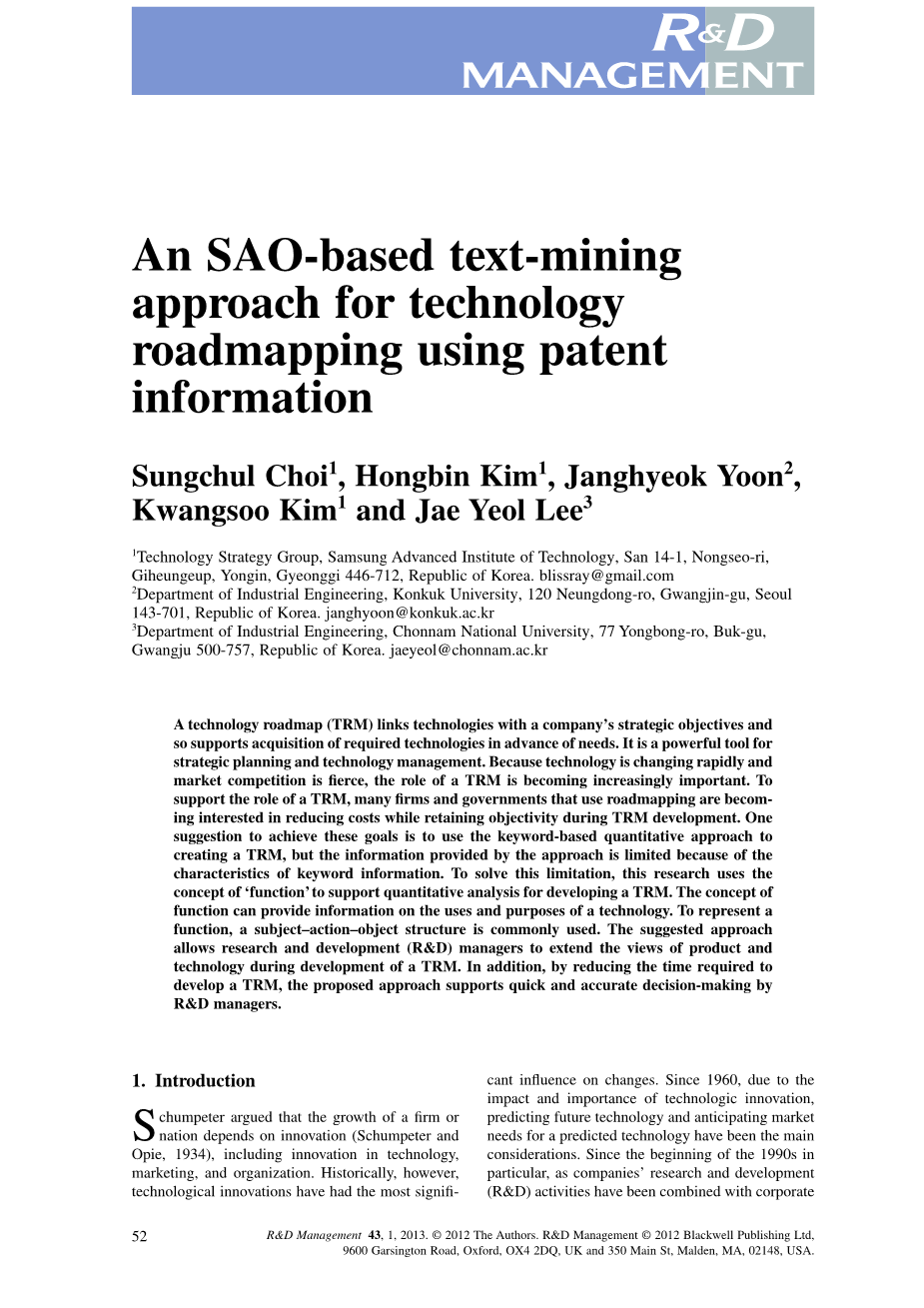 由于专利信息的特点,对基于关键字的TRM的开发以及基于SAO-based的技术分析的研究都采用了专利挖掘方法进行技术分析。特别是,由于专利信息是作为一个庞大的数据库管理的,并且有明确的书目数据,所以这一信息很容易获取和处理以计算机为基础的技术分析。