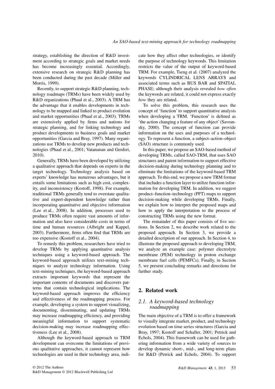 Lee et al.(2008, 2009)和Yoon等人(2008a,b)正在积极研究基于关键词的TRM方法。以前的研究主要集中在利用文本挖掘技术从专利中寻找技术影响,Lee和Yoon都考虑了如何利用提取的技术对发展TRM的影响,即他们的研究比以前的研究更侧重于紧密地联系起来进行分析技术信息和TRM过程。