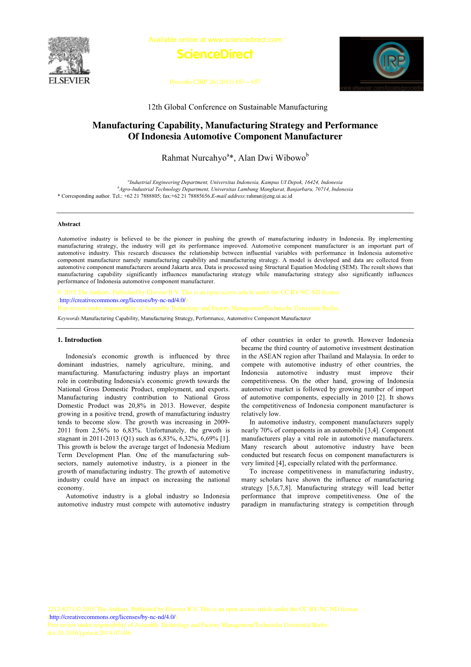 印度尼西亚汽车零部件制造商的制造能力,制造战略和制造绩效