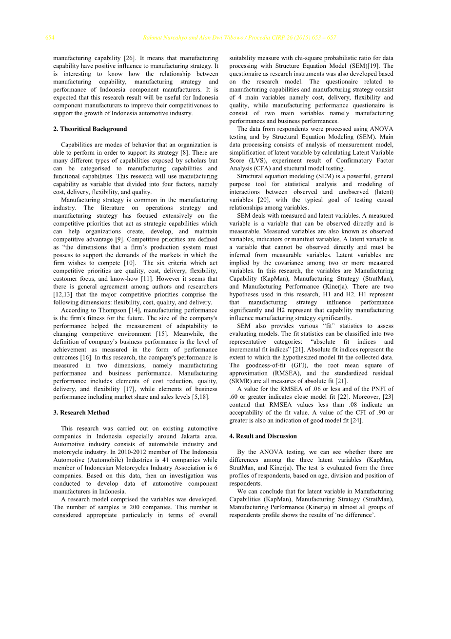 为了提高制造业的竞争力,许多学者已经证明了制造战略的影响[5,6,7,8]。制造战略将带来更好的绩效,从而提高竞争力。制造战略的一个范例是通过制造能力进行竞争[2,6]。这意味着制造能力对制造战略具有积极的影响。了解印度尼西亚零部件制造商的制造能力、制造策略和绩效之间的关系是很有意思的。预计本研究成果将有助于印尼零部件制造商提高竞争力,支持印尼汽车工业的发展。