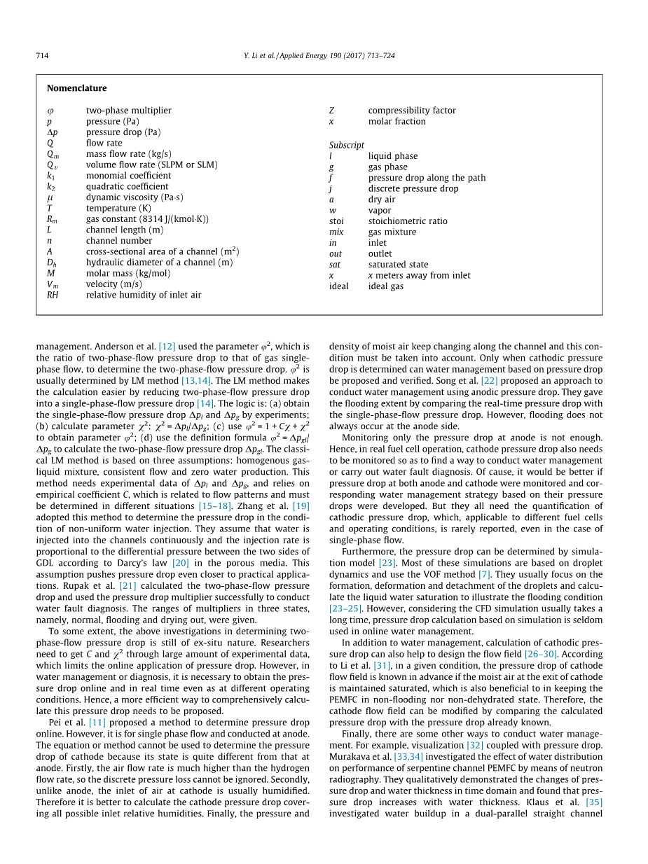 阴极压降时才能提出并验证基于压降的水管理。Song等人提出了一种使用阳极压降进行水管理的方法。他们通过比较实时压降和单相流压降来给出溢流程度。然而,在阳极侧并不总是发生溢流。仅监测阳极处的压降是不够的。因此,在实际燃料电池运行中,还需要监测阴极压降,以便找到进行水管理或进行水故障诊断的方法。因此,如果监测阳极和阴极的压降并且基于其压降产生相应的水管理策略将会更好。但它们都需要量化阴极压降,即使在单相流的情况下,也很
