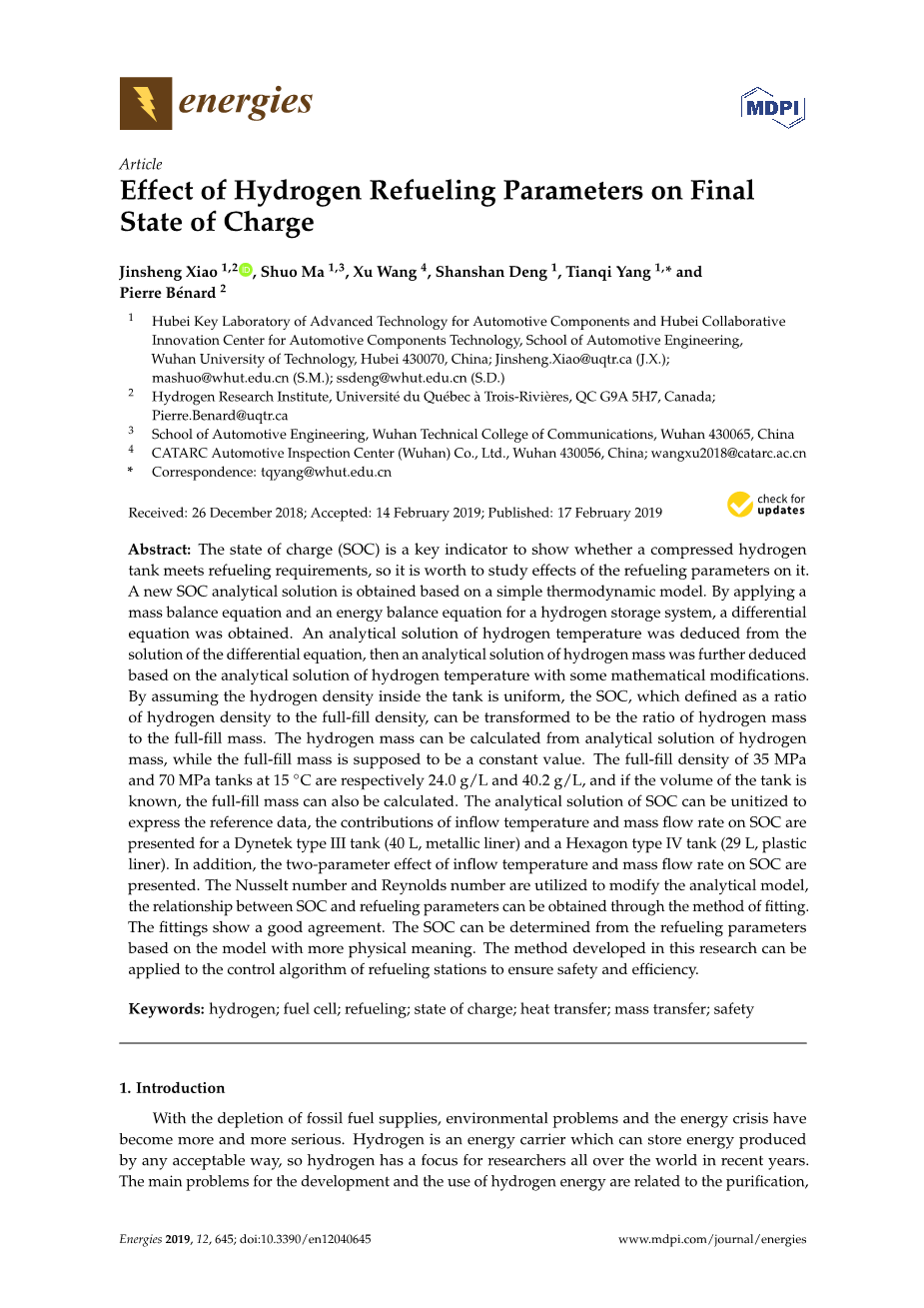 摘要:充电状态(SOC)是衡量压缩氢气罐满足加油要求的关键指标,因此加油参数对其的影响值得研究。基于简单的热力学模型获得了新的SOC分析解决方案。通过应用氢储存系统的质量平衡方程和能量平衡方程,得到了微分方程。从微分方程的解推导出氢温度的解析解,然后基于氢温度的解析解和一些数学修正进一步推导出氢质量的解析解。通过假设罐内的氢浓度是均匀的,可以将SOC(其定义为氢密度与满填充密度的比率)转换为氢质量与满填充质量的比率。氢质量可以从氢质量的解析解计算,而全填充质量应该是恒定值。在15 ◦C下,35MPa和70MPa罐的满填充密度分别为24.0g / L和40.2g / L,并且如果已知罐的体积,也可以计算满填充质量。SOC的解析解可以组合起来表示参考数据,流入温度和质量流量对SOC的贡献是针对Dynetek III型罐(40L,金属衬管)和Hexagon IV型罐(29L,塑料衬垫)。此外,还介绍了流入温度和质量流量对SOC的双参数影响。利用努塞尔数和雷诺数修改分析模型,通过拟合方法得到SOC与加油参数之间的关系。这些显示出很好的一致性。可以基于具有更多物理意义的模型从加油参数确定SOC。本研究开发的方法可以应用于加油站的控制算法,以确保安全和效率。