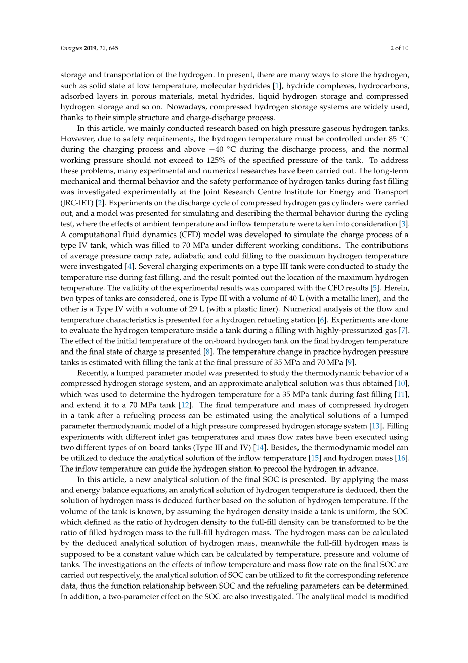 在本文中,我们主要进行了基于高压气态氢气罐的研究。但是,由于安全要求,在充电过程中氢气温度必须控制在85 ◦C以下,在放电过程中必须控制在-40 ◦C以上,正常工作压力不应超过储罐规定压力的125%。为了处理这些问题,已经进行了许多实验和数值研究。在联合研究中心能源与运输研究所(JRC-IET)实验研究了快速灌装期间氢气罐的长期机械和热性能以及安全性能[2].对压缩氢气瓶的放电循环进行了实验,并给出了模拟和描述循环试验过程中热行为的模型,其中考虑了环境温度和流入温度的影响[3].开发了计算流体动力学(CFD)模型来模拟IV型罐的装料过程,其在不同的工作条件下填充至70MPa。研究了平均压力升温速率,绝热和冷填充对最高氢温的贡献[4].在III型罐上进行了几次充电实验,以研究快速充填过程中的温升,结果指出了最高氢温度的位置。实验结果的有效性与CFD结果进行了比较[5].在此,考虑两种类型的罐,一种是体积为40L的III型(带有金属衬里),另一种是体积为29L的IV型(带有塑料衬里)。对加氢站的流量和温度特性进行了数值分析[6].在填充高压气体的过程中,进行了实验以评估罐内的氢气温度[7].给出了车载氢气罐初始温度对最终氢气温度和最终充电状态的影响[8].实际氢气压力罐的温度变化是通过在35 MPa和70 MPa的最终压力下填充罐来估算的[9].最近,提出了一个集总参数模型来研究压缩氢储存系统的热力学行为,从而得到了近似的解析解 [10],用于确定快速灌装期间35 MPa罐的氢气温度[11],并将其延长至70兆帕的水箱[12].加油过程后罐内压缩氢的最终温度和质量可以使用高压压缩氢存储系统的集总参数热力学模型的解析解来估算[13].使用两种不同类型的机载油箱(III型和IV型)进行了不同入口气体温度和质量流量的填充实验[14].此外,热力学模型可用于推导进汽温度[15]和氢质量 [16]的解析解。进氢温度可指导制氢站提前预冷制氢。。