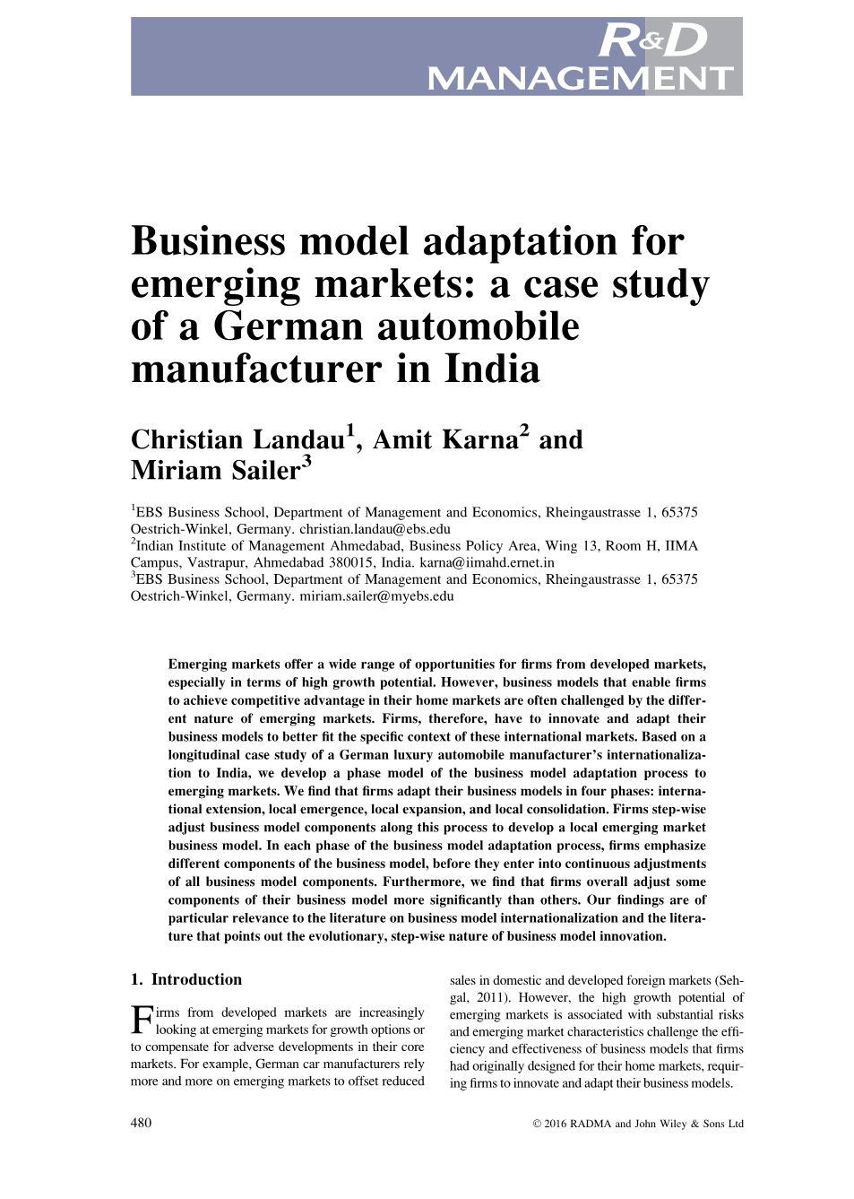 为了缩小差距,我们分析了企业如何根据新兴市场的具体情况调整为发达国家设计的商业模式。更具体地说,我们正在寻找本文中以下两个研究问题的答案:在商业模式适应过程中,特别是进入新兴市场时,企业经历了哪些阶段?在这一过程中,财务模型的哪些组成部分(以及在多大程度上)进行了调整?我们通过对一家优质汽车制造商及其在印度国际化的纵向案例研究来寻求这些问题的答案。