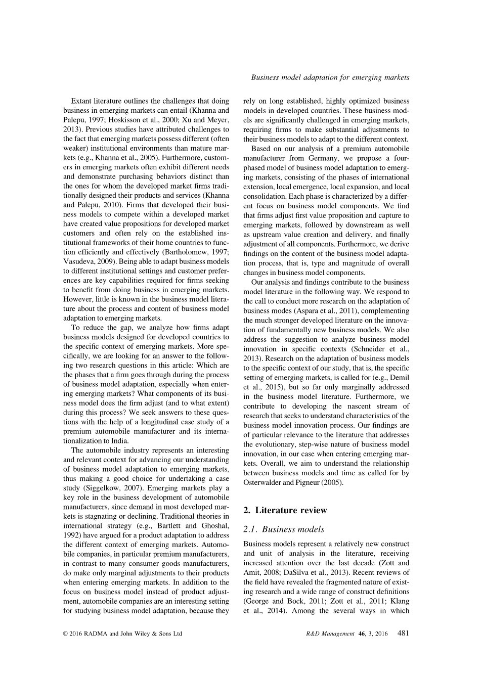 现有文献概述了在新兴市场开展业务可能带来的挑战(Khanna和Palepu,1997年;Hoskisson等人,2000年;Xu和Meyer,2013年)。先前的研究将挑战归因于新兴市场具有不同于成熟市场(例如,Khanna等人,2005年)的(通常较弱)制度环境这一事实。此外,新兴市场的客户往往表现出不同的需求,表现出与发达市场公司传统上为其设计产品和服务的客户不同的购买行为(Khanna和Palepu,2010年)。开发商业模式以在发达市场内竞争的公司已经为发达市场客户创造了价值主张,并且往往依靠本国的既定制度框架来高效地发挥作用(Bartholomew,1997;Vasudeva,2009)。能够适应不同的商业模式。机构设置和客户偏好是企业在新兴市场开展业务寻求收益的关键能力。然而,在商业模式文献中,对于商业模式适应合并市场的过程和内容知之甚少。