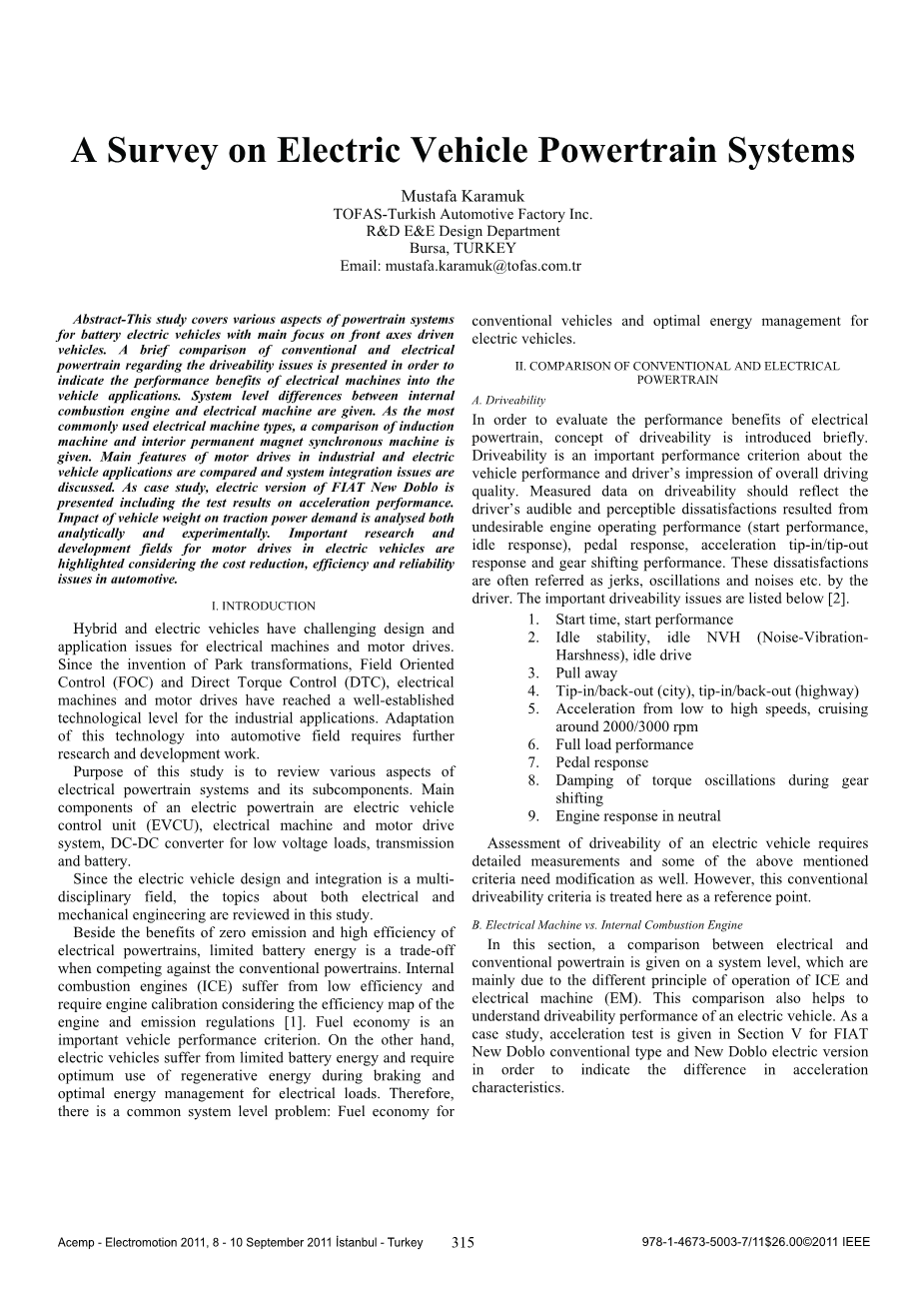 该研究涵盖了电池电动汽车动力传动系统的各个方面,主要集中在前轴驱动车辆。为了说明电机在车辆应用中的性能优势,本文简要比较了传统动力系统和电动动力系统的驾驶性能问题。给出了内燃机与电机的系统差别。作为最常用的电机类型,对感应电机和内永磁同步电机进行了比较。比较了电机驱动在工业和电动汽车应用中的主要特点,讨论了系统集成问题。以菲亚特新doblo电动版本轿车为例,介绍了电动版的加速性能测试结果。通过分析和试验,分析了车辆重量对牵引功率需求的影响。从降低成本、提高效率和可靠性等方面,重点介绍了电动汽车电机驱动的重要研究和开发领域。