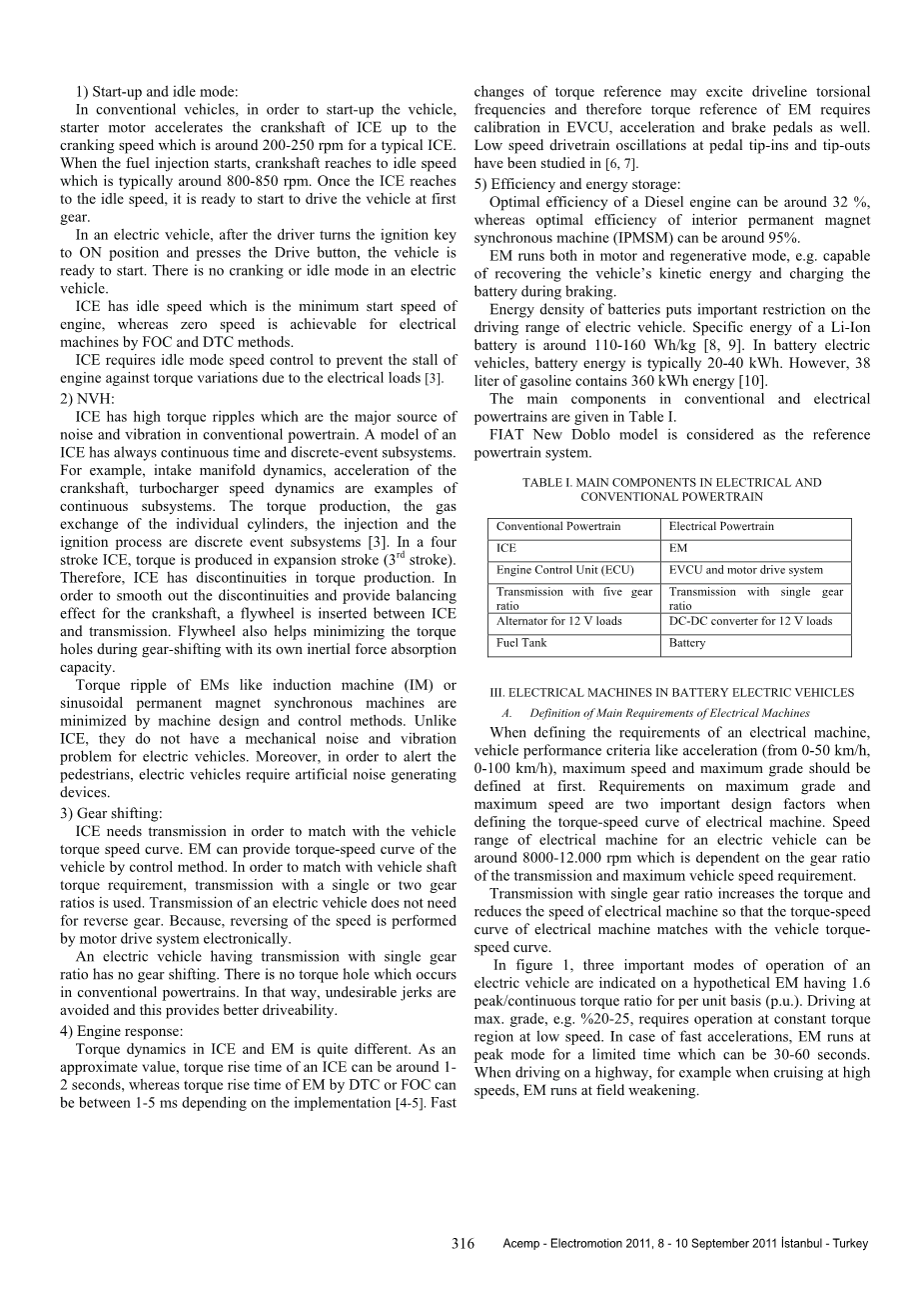 在本节中,将电动动力总成与传统动力总成在系统层面进行比较,主要是由于内燃机和电机(EM)的工作原理不同。这一比较也有助于了解电动汽车的驾驶性能。作为一个案例研究,第五节对菲亚特新型多勃罗传统型和新型多勃罗电动版进行了加速试验,以说明加速特性的差异。