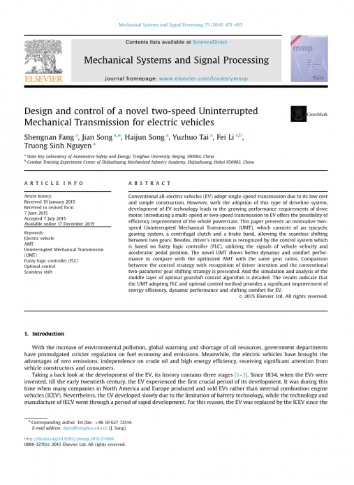 关键词:电动汽车 AMT 不间断机械变速器(UMT) 模糊逻辑控制器(FLC)最优控制 无缝转变
