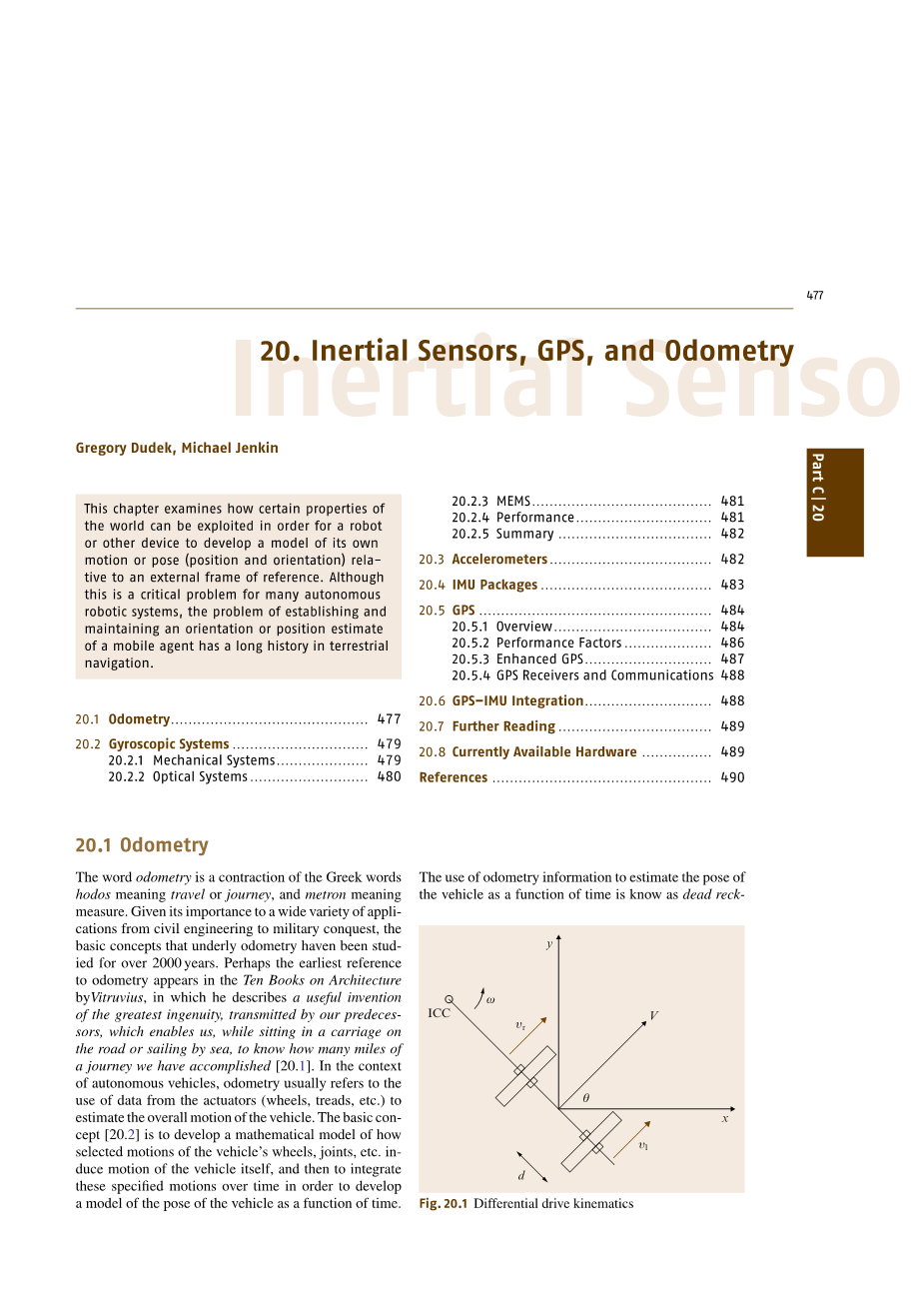 单词odometry是希腊词“hodos”意思是旅行或旅程和“metron”意思是量度或尺寸的缩写词。考虑到各种各样的土木工程应用武力征服它的重要性,测程法已经研究了超过2000年的基本概念。 也许最早提到测距法的内容出现在维特鲁威的建筑十本书中,其中他描述了一个由我们的前辈传递的最有创造力的有用发明,它使我们坐在马路上或海上航行时, 知道我们已经完成了多少英里的旅程[20.1]。在自主车辆的情况下,测距通常指的是使用来自致动器(车轮,踏板等)的数据来估计车辆的整体运动。 基本概念[20.2]是建立一个数学模型,说明车辆的车轮,关节等的选定运动如何引起车辆本身的运动,然后随着时间的推移整合这些指定的运动,以便开发姿态模型作为时间的函数的车辆。作为一个时间的函数,里程计信息用来估计车辆姿态被称为航位推算或演绎推算,并在海上航行中得到广泛应用[20.3]。