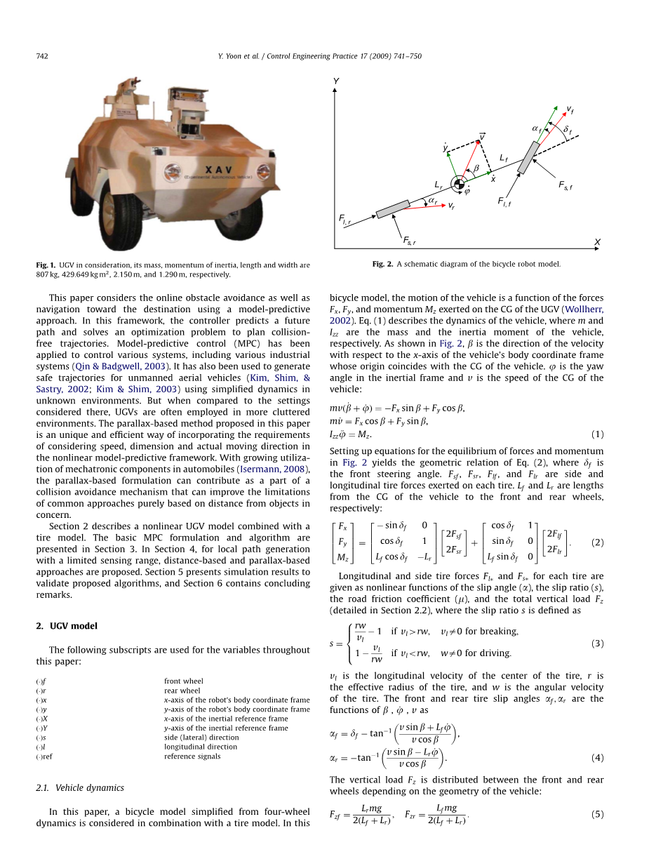 使用模型预测方法导航到目的地。在这个框架中,控制器预测未来的路径,并解决了一个优化问题来规划无碰撞轨迹。模型预测控制(MPC)已被应用于控制的各种系统,包括各种工业系统(2003秦与badgwell,)。它也被用来产生无人机安全的轨迹(基姆,Shim,和沙斯特里,2002;基姆amp;垫片,2003)在未知环境中使用简化fiED动力学。但相比于设置认为,无人地面车辆经常被用在更杂乱的环境中。视差法提出了一种独特的方式将EFfi充分考虑速度的要求,尺寸和实际在非线性模型预测框架移动方向。随着利用机电一体化汽车零件(Isermann,2008),可以作为一个基础配方,可以改善常见的方法是基于距离的物体在关注限制冲突避免机制的一部分,有助于视差。2节介绍了一种非线性的UGV结合轮胎模型。第3节给出了基本MPC公式和算法。在第4节中,针对有限感知范围的本地路径生成,提出基于距离和视差的方法。第5节给出了仿真结果,以验证所提出的算法,第6节包含结束语。