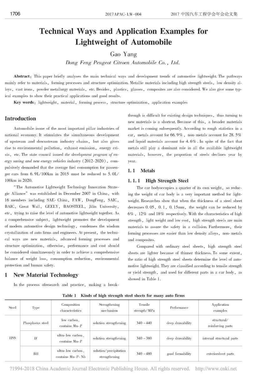 “汽车轻量化技术创新战略联盟”于2007年12月在中国成立,包括SAE-中国,中国第一汽车集团,东风汽车公司,上汽集团,北汽集团,长城汽车,吉利汽车,宝钢,吉林大学,都在努力提升汽车轻量化水平。作为一个全面的主题,轻量化凝聚了智慧汽车公司和工程师的结晶,促进了现代汽车设计技术的发展。目前,技术方法有新材料,先进的成型工艺和结构的优化,此外,也应该考虑性能和成本,以实现全面轻量化的平衡,降低成本,提高环保性和人身安全。