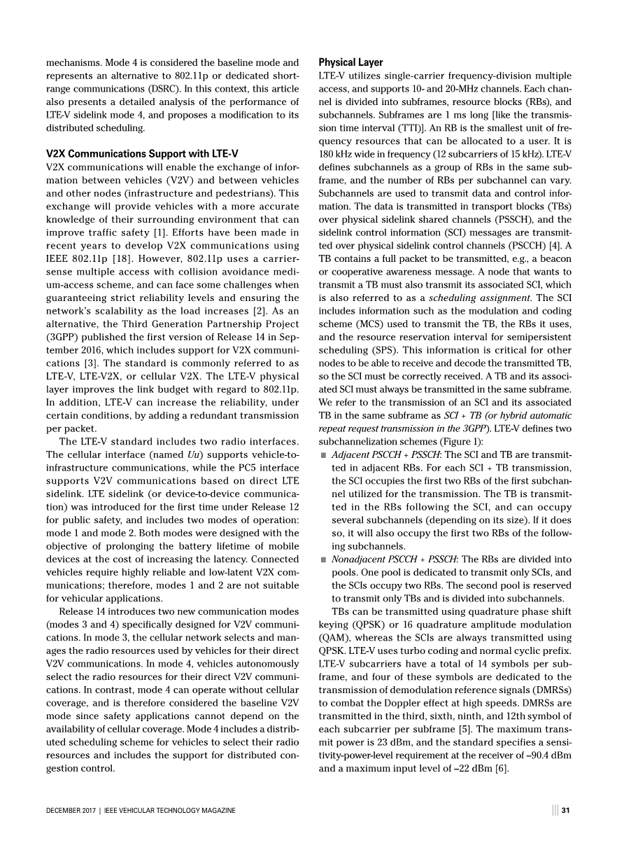 当保证严格的可靠性水平并确保随着负载增加网络的可扩展性时面临挑战[2]。作为替代方案,第三代合作伙伴计划(3GPP)于2016年9月发布了第一版第14版,其中包括对V2X通信的支持[3]。该标准通常被称为LTE-V,LTE-V2X或蜂窝V2X。 LTE-V物理层改善了关于802.11p的链路预算。另外,在某些情况下,LTE-V可以通过增加每个数据包的冗余传输来提高可靠性。