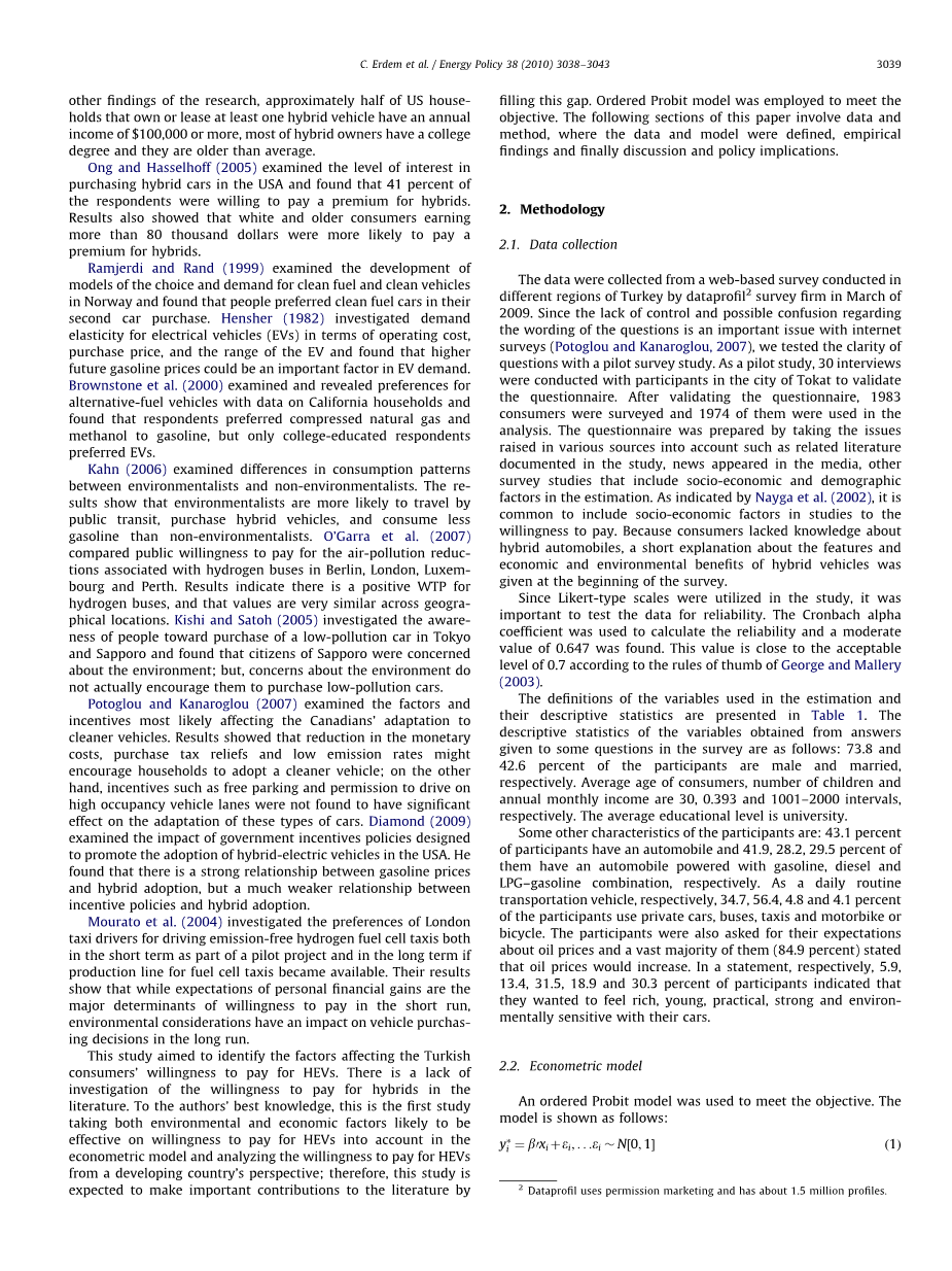 这些数据来自于2009年3月由dataprofil调查公司在土耳其不同地区进行的一项网络调查。由于对这些问题的缺乏控制和可能混淆是互联网调查的一个重要问题(Potoglou和Kanaroglou,2007),我们用试点调查研究测试了问题的清晰度。作为试点研究,与托卡特市的参与者进行了30次访谈,以验证问卷。在对问卷进行验证后,对1983名消费者进行了调查,其中1974名被用于分析。调查问卷是通过考虑各种来源提出的问题而编写的,例如研究记录的相关文献,媒体中出现的消息以及估计中包括社会经济和人口因素的其他调查研究。正如Nayga等人所指出的那样(2002年),研究中将社会经济因素纳入支付意愿是很常见的。由于消费者缺乏混合动力汽车的知识,因此在调查开始时就对混合动力汽车的特点,经济和环境效益做了简要说明。