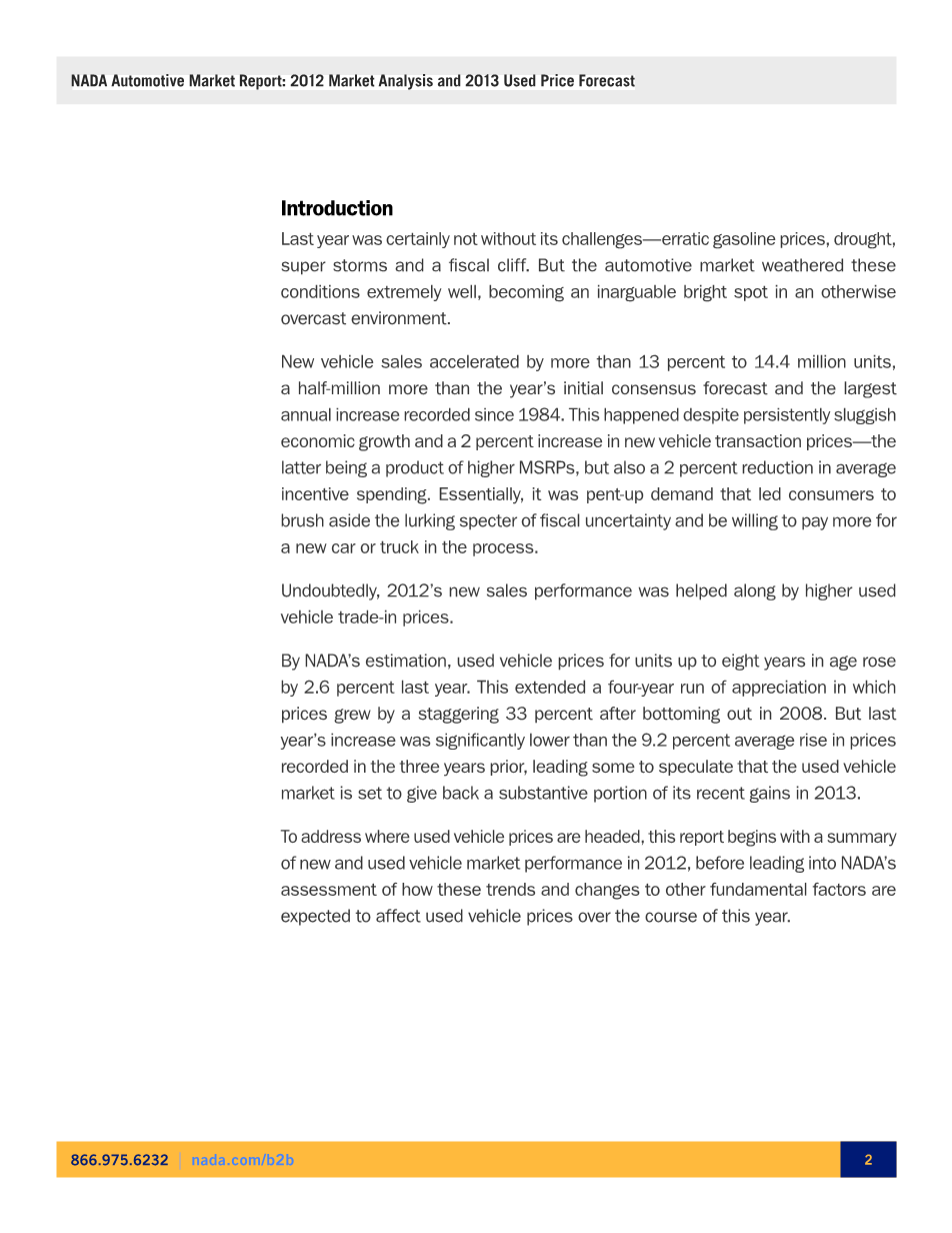 为了解决二手车价格走向的问题,这份报告首先总结了2012年新车和二手车市场的最新表现,然后才得出了NADA对这些趋势和其他基本因素的影响预计会产生何种影响的评估。