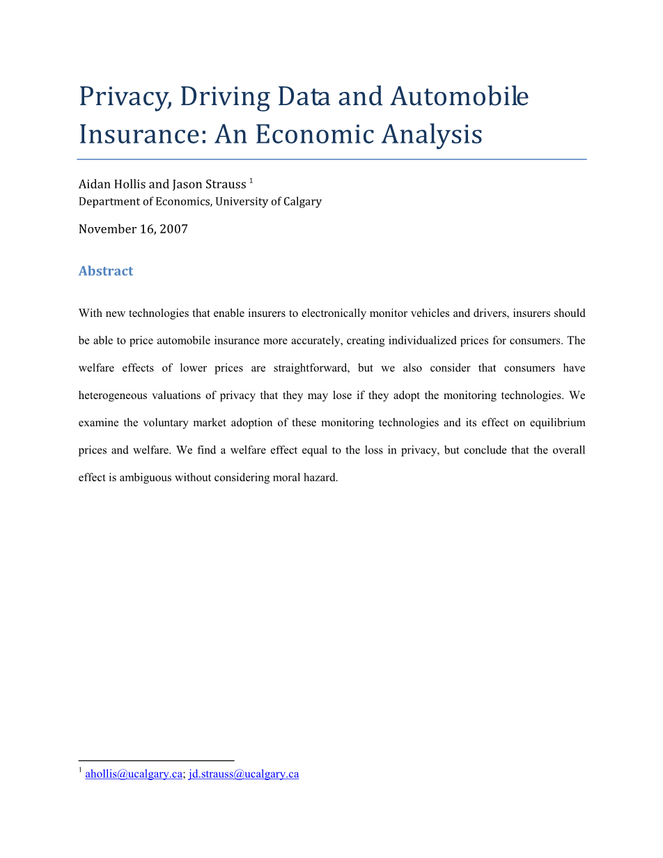 有了新技术,保险公司可以对车辆和司机进行电子监控,据此,保险公司能够提供更为准确的车险定价,并可根据不同消费者制定个性化的价格。更低的车险定价所带来的福利效应是直接的,但同时我们也认为如果采用电子技术对车辆和司机进行监控,可能会存在基于隐私的异质性评价。我们审查试点地区市场采用这些监测技术及其对平衡的影响价格与福利的过程中发现福利效应等同于隐私的损失,但总体而言,不考虑道德风险的影响是模糊的。