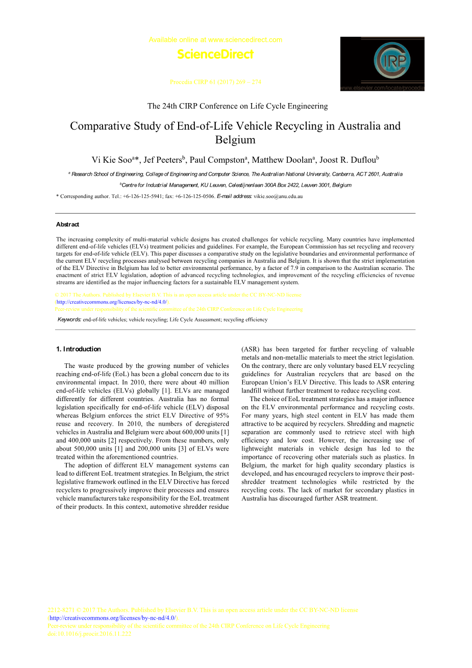采用不同的ELV管理系统会导致不同的EoL处理策略。在比利时,ELV指令中概述的严格的立法框架已迫使回收商逐步改进其流程,并确保汽车制造商对其产品的EoL处理负责。在这种情况下,自动碎纸机残渣(ASR)的目标是进一步回收有价金属和非金属材料,以符合严格的立法。相反,对于澳大利亚的回收商来说,只有基于自愿的ELV回收指南是基于欧盟的ELV指令的。这导致ASR进入垃圾填埋场没有能够进一步处理,以降低回收成本。