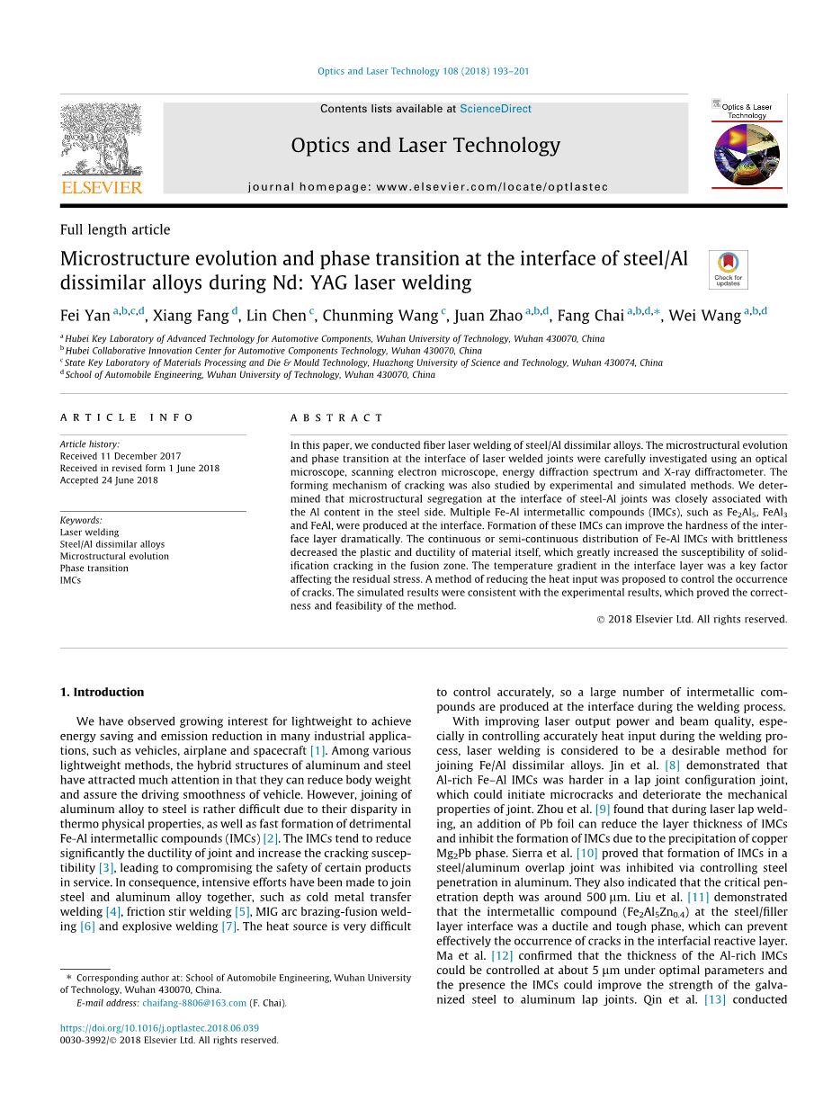 [2] C.M. Wang, L.Y. Cui, G.Y. Mi, P. Jiang, X.Y. Shao, Y.M. Rong, The influence of heat input on microstructure and mechanical properties for dissimilar welding of galvanized steel to 6061 aluminum alloy in a zero-gap lap joint configuration, J. Alloy. Compd. 726 (2017) 556–566.