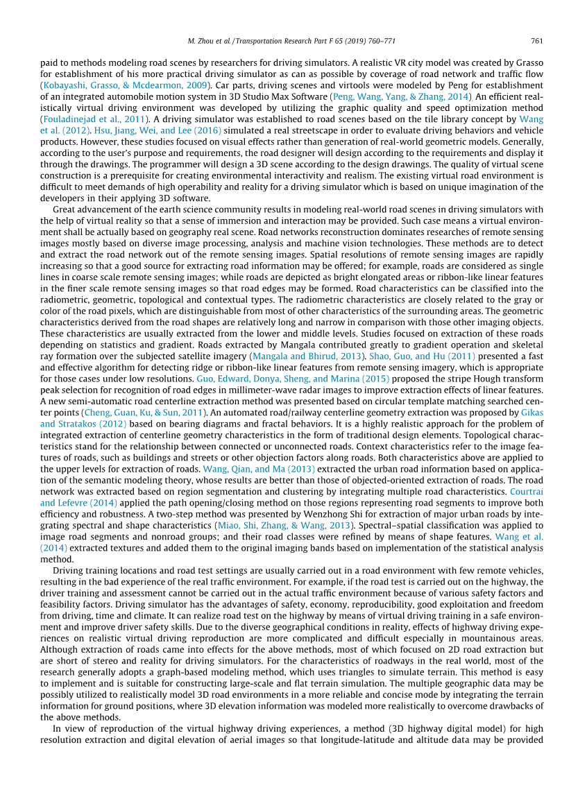 地球科学界的巨大进步使得虚拟现实技术在驾驶模拟器中建立了真实的道路场景模型,从而提供了一种沉浸感和交互感。这种情况意味着虚拟环境应以地理真实场景为实际基础。道路网络重构是道路网络改造的主要研究方向。遥感图像主要基于多种图像处理、分析和机器视觉技术。这些方法是对遥感图像中的道路网络进行检测和提取。遥感图像的空间分辨率正在迅速提高,以便为提取道路信息提供良好的来源;例如,在粗比例尺遥感图像中,道路被视为单线;而道路被描绘成明亮的拉长区域或较细尺度遥感图像中类似带状的线性特征,以便形成道路边缘。道路特征可分为辐射型、几何型、拓扑型和上下文型。辐射特性与道路像素的灰度或颜色密切相关,与周围大部分区域的其他特征有很大的区别。与其他成像对象相比,从道路形状得到的几何特征是相对较长、较窄的。这些特征通常是从中下层提取出来的。研究的重点是根据统计数据和坡度提取这些道路。芒加拉提取的道路对卫星图像上的梯度操作和骨骼射线形成有很大的贡献。Mangala和Bhirud,2013年). 邵国华(2011)提出了一种快速有效的遥感图像脊线或带状线性特征检测算法,适用于分辨率较低的情况。郭、爱德华、多尼娅、盛和玛丽娜(2015)提出了一种用于毫米波雷达图像道路边缘识别的条纹Hough变换峰值选择方法,以提高线性特征的提取效果。提出了一种基于圆形模板匹配搜索中心点的半自动道路中心线提取方法。程、关、库、孙,2011)。提出了一种自动的道路/铁路中心线几何提取方法。Gikas和Stratakos(2012年)基于轴承图和分形行为。以传统设计元素的形式对中心线几何特征进行综合提取是一种非常现实的方法。拓扑特性代表连通或不连通道路之间的关系。语境特征是指道路的图像特征,如建筑物、街道或道路沿线的其他反对因素。上述两种特征都适用于上层道路的提取。王、钱、马(2013)应用语义建模理论对城市道路信息进行提取,其结果优于面向对象的道路信息提取。基于区域的道路网络提取方法。分割并结合多种道路特征进行聚类。Courtrai和Lefevre(2014年)将路径开闭方法应用于代表路段的区域,提高了效率和鲁棒性。本文提出了一种结合光谱特征和形状特征的两步提取主要城市道路的方法。苗、石、张、王,2013年)。对图像中的路段和非道路组进行光谱-空间分类,并利用形状特征对它们的道路分类进行细化。Wang等人(2014年)基于统计分析方法的实现,提取纹理并将它们添加到原始成像波段。