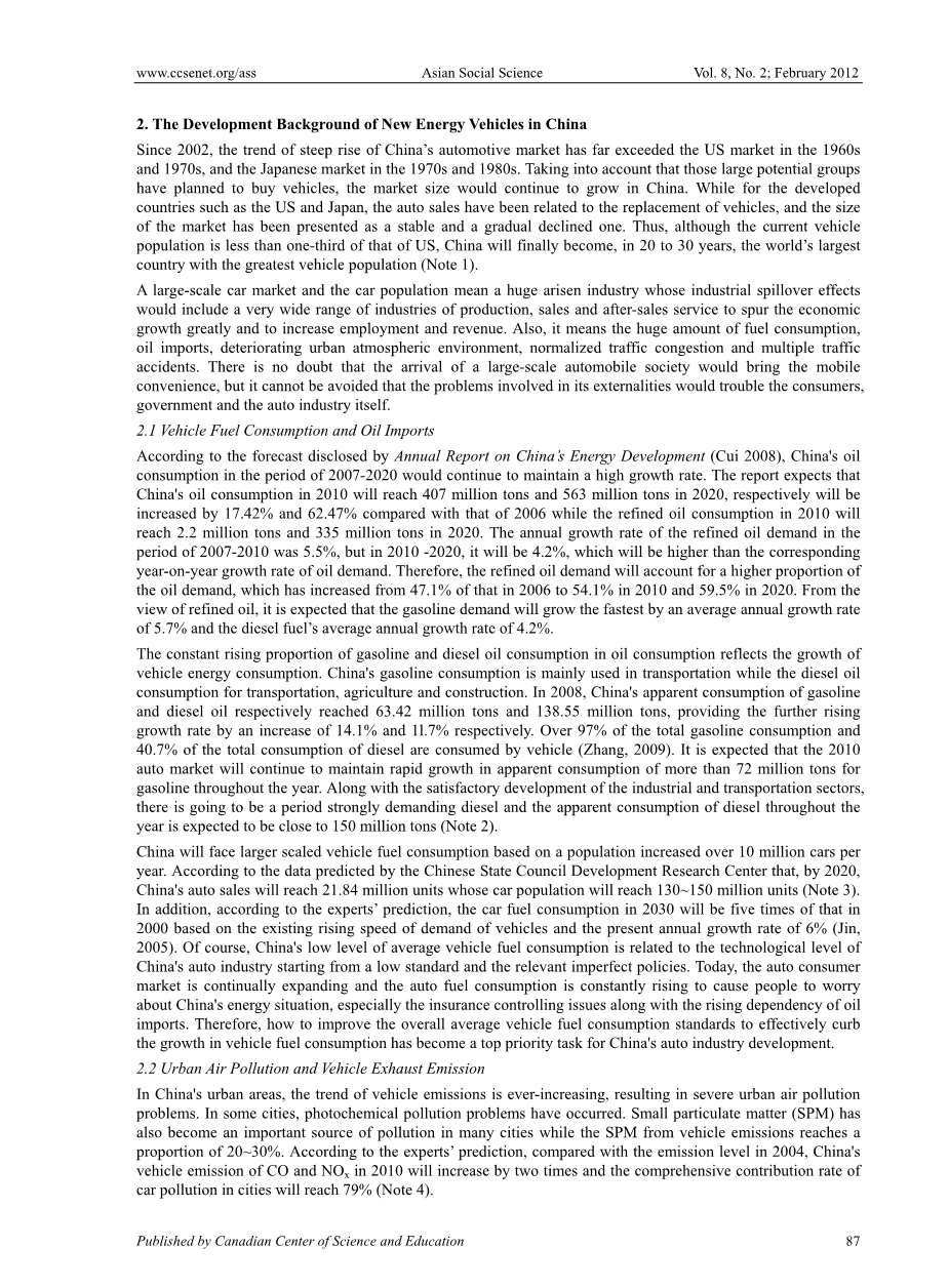 大型汽车市场和汽车的人口意味着一个巨大的新兴产业,其产业外溢效应将包括一个非常广泛的生产,销售和售后服务的行业,以刺激经济增长,并增加就业和收入。此外,它意味着大量的燃料消耗,石油进口,城市大气环境恶化,交通拥堵和多交通事故。毫无疑问,大规模的汽车社会的到来将带来移动便利,但它不能避免涉及到给消费者,政府和汽车行业本身带来麻烦的外部问题。