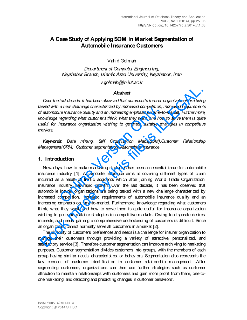 数据挖掘工具是一种流行的分析手段,以期获得对每个客户行为的更深入的理解。从数据挖掘结果中提取的知识被视为知识模式和规则,以便向汽车保险公司提出建议和解决方案。 在过去的十年中,自组织地图(SOM)已经成为一个有价值的数据挖掘工具,用于通过过程/反应监测和无监督分类目的提取知识模式和规则[4-8]。 在本文中,试图将无监督的自组织地图应用于基于他们的行为和需求的保险服务的客户的分类。