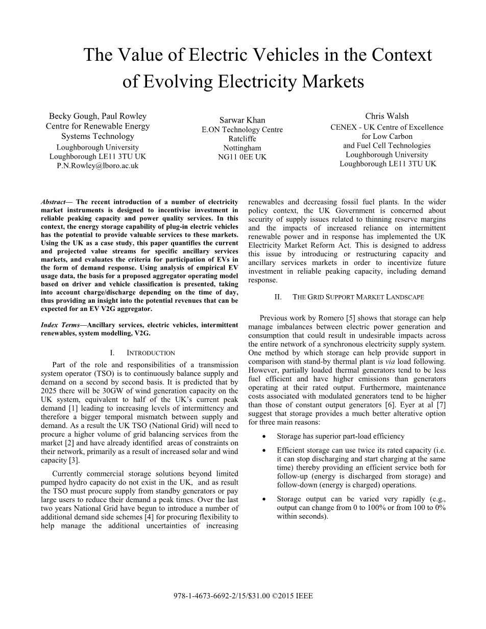 摘要:电力市场最近引进了一批电力市场工具,目的是激励可靠的调峰能力和电能质量服务的投资。在这种情况下,插电式电动车辆的能量存储能力具有为这些市场提供有价值的服务的潜力。本文使用英国作为案例研究,量化了特定辅助服务市场的当前和预计价值流,并以需求响应的形式评估了电动汽车的参与标准。利用电动汽车使用数据的经验分析,基于驾驶员和车辆分类的建议的聚合操作模型的基础提出,考虑到充电/放电取决于一天中的时间,从而提供深入了解,可以预期潜在的收入对于电动汽车(网络化的车辆)聚合器。