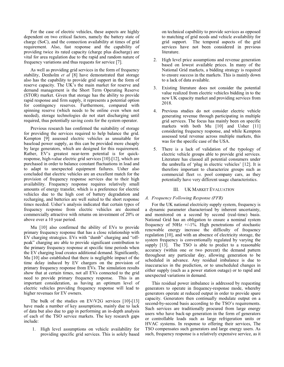 德诺姆等人[8]以频率稳定性的形式提供电网服务,表明存储还具有以备用容量形式提供电网支持的能力。英国储备和需求管理的主要市场是短期经营储备市场。由于存储能够提供快速响应和稳定供应,它是应急储备的潜在选择。此外,与旋转备用(需要在线即使不需要)相比,存储技术在需要之前不开始放电,因此潜在地节省了系统操作者的成本。以前的研究已经证实存储器适于提供所需的服务以帮助平衡电网。肯普顿 [9]认为电动车辆不适合基本负载电源,因为这可以通过为这种要求设计的大型发电机更便宜地提供。相反,电动汽车最大的近期潜力是快速响应,高价值电网服务[10] - [12],为了平衡负载的不稳定波动和适应意外的设备故障。亚瑟还得出结论,电动汽车是提供频率响应服务的最佳匹配,因为它们的高可用性。频率响应需要相对少量的能量传输,这是由于电池劣化和再充电的高成本而优选用于电动车辆,并且电池非常适合于所需的短响应时间。亚瑟的分析表明,电动汽车的某些类型的频率响应被认为具有商业吸引力,并且在10年内的投资回报率为20%或以上。穆[10]也证实了电动车提供与电动车充电策略有密切关系的主频率响应的能力。具有“哑”充电和“外峰”充电的电动汽车能够在电动汽车充电负载产生额外需求时在特定时间段对主要频率响应提供显着贡献。值得注意的是,穆[10]也确定了电动汽车充电器引起的时间延迟对从电动汽车提供初级频率响应的影响可以忽略不计。模拟结果表明,在某些时候,不是所有连接到电网的电动汽车都需要提供初级频率响应。这是一个重要的考虑,因为具有提供频率响应的电动车辆的最佳水平将导致电动汽车所有者的更高的收入。