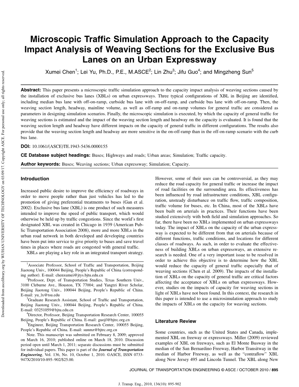 Xumei Chen; Lei Yu, Ph.D., P.E., M.ASCE; Lin Zhu; Jifu Guo; and Mingzheng Sun