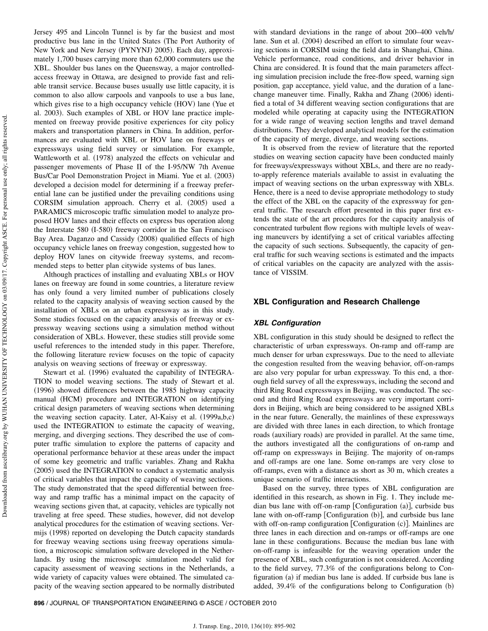 增加公众对于提高道路效率以便移动人而不仅仅是车辆的愿望已经导致促进给予公共汽车优惠的方法。 专用车道(XBL)是旨在提高公共交通速度的措施之一,否则交通拥堵会阻碍公共交通。 由于世界上第一个指定的XBL是在1939年在芝加哥(美国公共交通协会2008)创建的,在发达国家和发展中国家的城市道路网中越来越多的XBL已经投入使用,优先于公共汽车,节省旅行时间在道路拥挤的一般道路上,XBL在综合运输战略中发挥关键作用。然而,它们的一些用途可能是有争议的,因为它们可能降低一般交通的道路容量或增加道路设施对周围区域的影响。它的有效性受到道路基础设施条件、XBL配置、对交通流量的不稳定干扰、交通组成、公交车交通量等的影响。在中国,大多数XBL是建立在城市道路中的。他们的功能已经得到广泛研究并拥有模拟方法。但到目前为止,并没有在任何城市高速公路上实施XBL。 XBLs对城市高速公路的能力的影响预计将不同于城市道路,因为不同的功能,交通条件和不同类型的道路的位置。因此,为了评估在城市高速公路上建造XBL的有效性,需要进行广泛的研究。为了实现这个目标,要解决的一个非常重要的问题之一是确定XBL如何降低一般交通(特别是织造部分)的能力。安装XBLs对一般交通能力的影响是影响城市高速公路XBLs接受的关键因素。然而,关于XBLs交汇部分的能力的影响的研究还没有找到。在这方面,本文的研究旨在使用微模拟方法来研究XBLs对交汇部分的能力的影响。