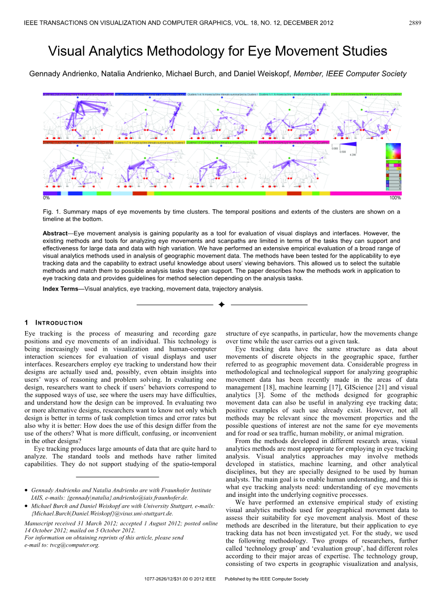 眼动跟踪数据具有与离散对象在地理空间中的移动数(即地理运动数据)相同的结构。在数据管理领域[18],最近相当进步的支持地理运动数据管理的分析方法和技术有机器学习[17],GIScience[21]和视觉分析[3]。一些为地理移动数据设计的方法也可用于分析眼动跟踪数据;这种正面的使用案例已经存在。但是,并不是全部方法都是相关的,因为对于眼动来说,其运动属性和可能感兴趣的问题与道路或海上交通、人员流动或动物迁移不是完全相同的。