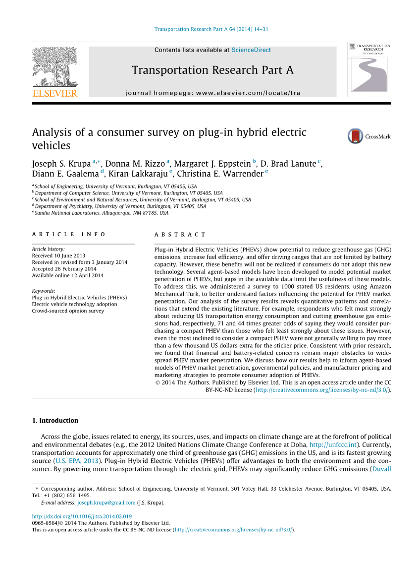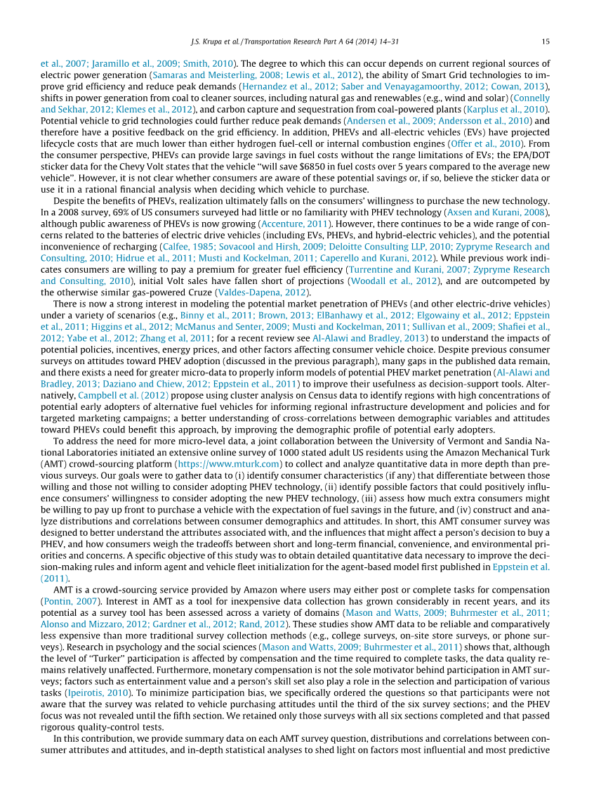 vious调查。 我们的目标是收集数据,以(i)识别区分这些的消费者特征(如果有的话)愿意和不愿意考虑采用PHEV技术的人,(ii)确定可能会积极影响的可能因素,使消费者愿意考虑采用新的PHEV技术,(iii)评估多少额外的消费者可能愿意在未来预期节省燃料的情况下预先支付购买车辆,以及(iv)分析消费者人口统计和态度之间的关系。 简而言之,这次AMT消费者调查是旨在更好地理解与之相关的属性,以及可能影响人们购买决定的影响PHEV,以及消费者如何权衡短期和长期财务,便利和环境保护之间的权衡,重要性和关注。这项研究的具体目标是获得详细的定量数据。AMT是亚马逊提供的服务,用户可以发布或完成补偿任务。对AMT作为廉价数据收集工具的兴趣近年来已经显着增长作为一种调查工具的潜力已经在多个领域得到评估。这些研究表明,和传统的调查收集方法(例如,大学调查,现场商店调查或电话监控)比AMT数据是相对可靠的。心理学和社会科学研究表明,尽管“Turker”论坛参与的水平受到补偿和完成任务所需的时间的影响,电源相对不受影响。 此外,货币补偿不是参与AMT交易的唯一动机,娱乐价值和个人技能等因素也在各种选择和参与中发挥作用任务。为了尽量减少参与偏见,我们特别订购了问题,以便参与者不会意识到该调查与车辆购买态度有关,直到六个调查部分中的第三个;和PHEV焦点没有透露到第五节。我们只保留了所有六个部分完成并且通过的那些调查严格的质量控制测试。在本文中,我们提供每个AMT调查问题,分布和相关性的汇总数据苏美尔属性和态度,以及深入的统计分析,以阐明最有影响力和最具预测性的因素的消费者愿意考虑PHEVs。 虽然我们的结果与现有文献一致, 超越了以前已经发布的信息,将支持更多的数据驱动模型并提供有用的信息,以便为希望宣传PHEV的政策制定者和制造商提供更好的信息。完整调查应被公开提供给其他研究人员的额外分析。